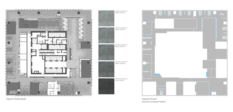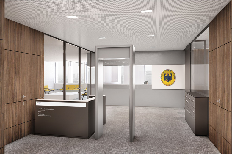 Das Sicherheitsschema für Auslandsvertretungen gilt stets übergeordnet und teilt den Grundriss in einen öffentlichen und gesicherten Bereich. Übergeordnet gilt, dass Gebäudeecken immer mit Sondernutzungen besetzt werden. Für das Projektbeispiel Shenyang sind dies: Foyer für offizielle Empfänge, Kanzleileitung, Lounge und Kommunikationsbereich für die Mitarbeiter sowie Visastellenleiter. Dazwischen wechseln sich offene und geschlossene Nutzungen ab und bilden eine natürliche räumliche Trennung. Das monotone System von Zellenbüro und langer Flur löst sich auf, und es entsteht ein abwechslungsreich fließender Raum.