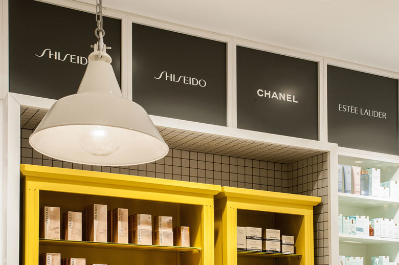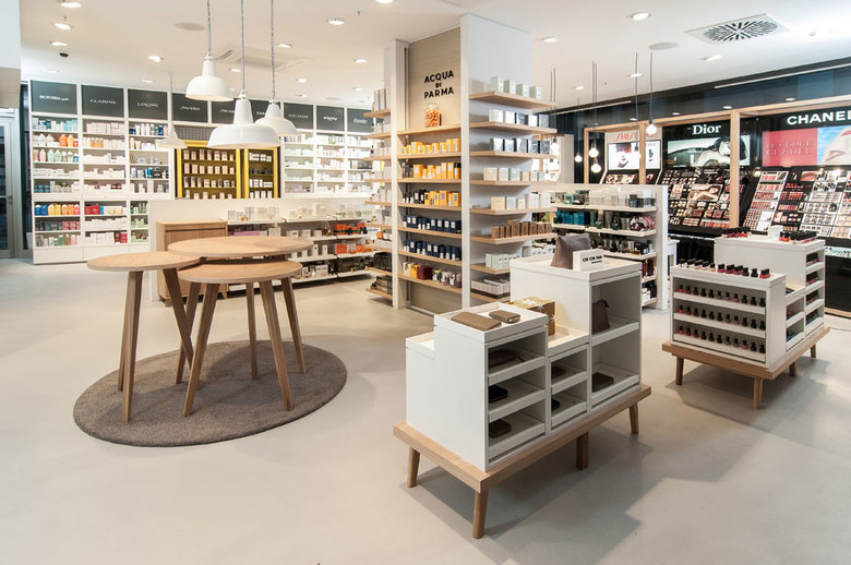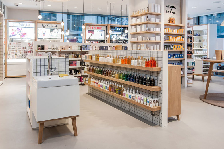 Trotz der unterschiedlichen Gestaltungssprachen der Bereiche haben sie Gemeinsamkeiten: Es finden sich ringsum wohnliche Stilelemente wie kleine Kommoden, aufgearbeitete Schränke, unterschiedliche Schminkkonsolen, Leuchten, Stühle oder Tische wieder, die die Regalabwicklungen unterbrechen und ergänzen und so zu einer lebendigen Atmosphäre auf der Verkaufsfläche beitragen.