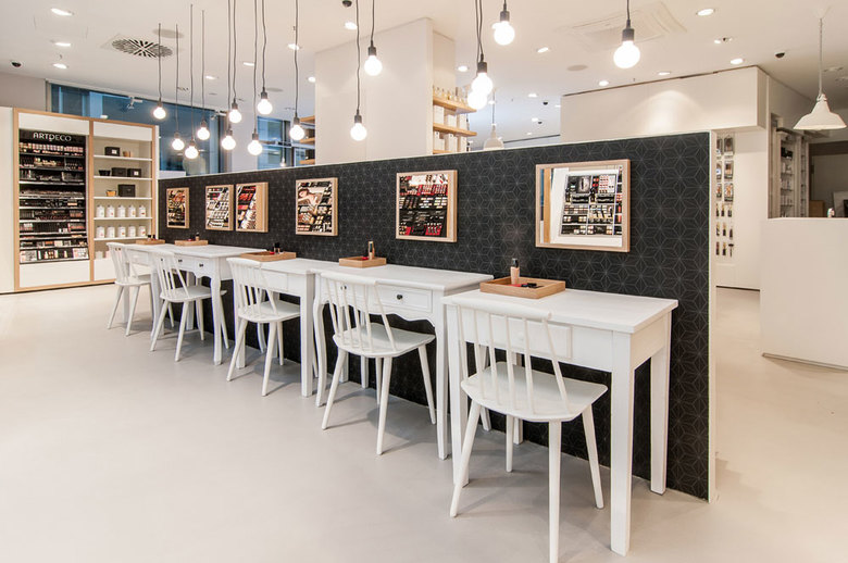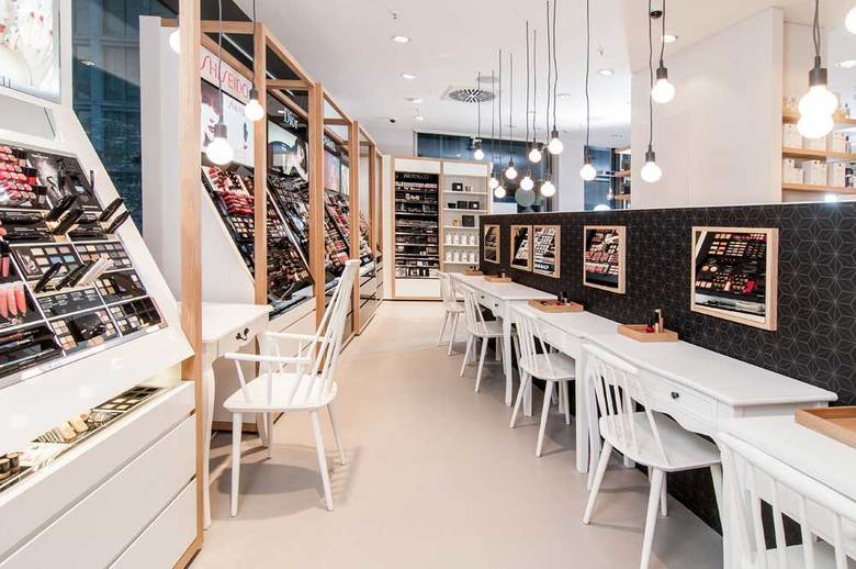 Im Anschluss betritt man den Make-Up-Bereich, in dem sich neben den Einbauten der Make-Up-Marken auch die Schminkschule befindet. Hier gibt es sechs nebeneinander angeordnete Schminkplätze sowie einen gegenüberliegenden Platz an dem den Schülerinnen die verschiedenen Kniffe eines gelungenen Make-Ups vorgestellt werden.