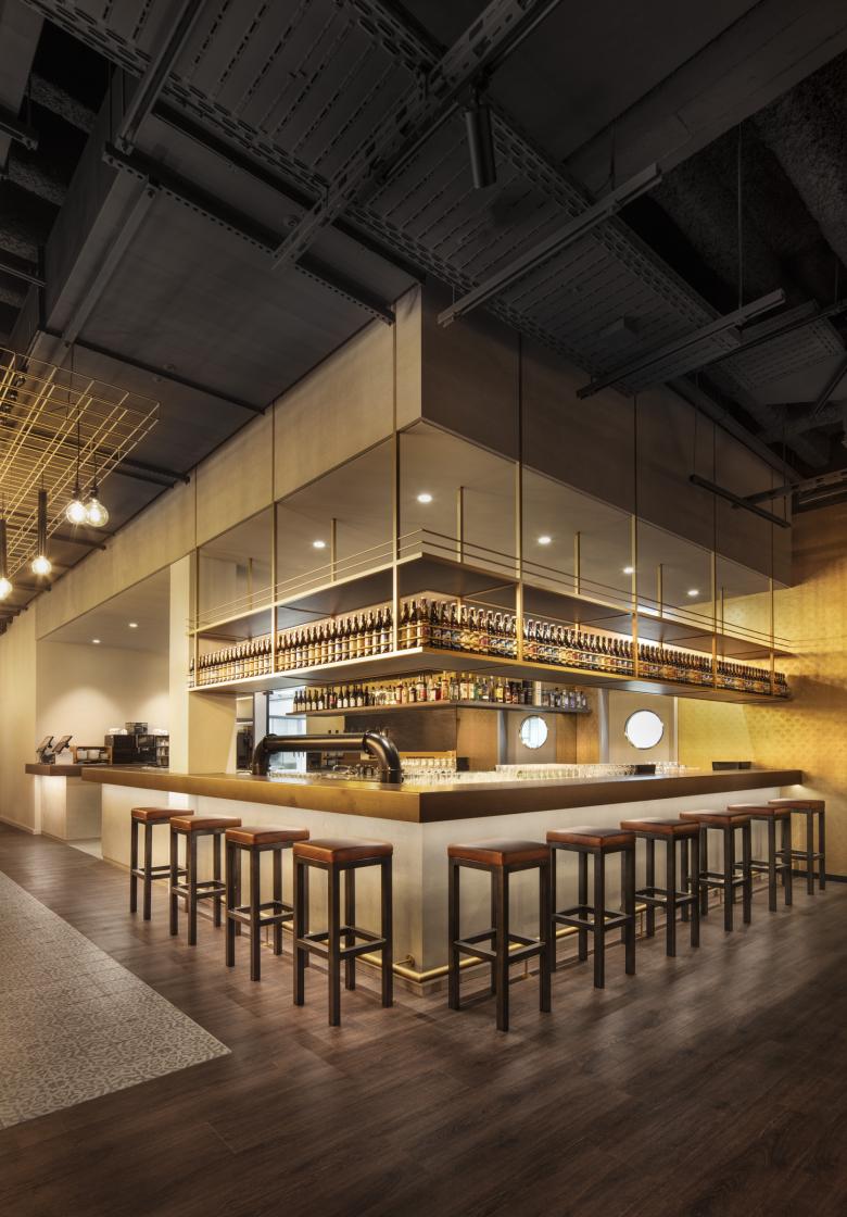 Der ehemals kleinteilige und abgeschirmte Keller öffnet sich nun zur Hirschstraße und zum Marktplatz hin. Der Eingangsbereich über die Empore gibt den Blick frei auf die offene Fläche und das gesellige Geschehen im Ratskeller. Die barrierefreie Treppe führt den Gast zum freien und einladenden Loungebereich des Lokals. Hochwertige Sessel aus nussbraunem Leder und goldene Wanddetails leiten die warme Farbpalette ein und richten den Blick auf das Herzstück des Raumes – die Hausbar. Deren Tresen präsentiert sich in Rohbauoptik in einem Industrial Design und setzt moderne Akzente in traditionellem Ambiente. Angrenzend bieten hohe Garnituren in heller, natürlicher Holzoptik eine weitere Sitzgelegenheit.