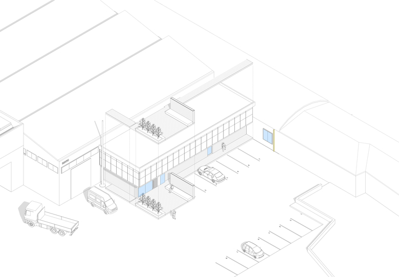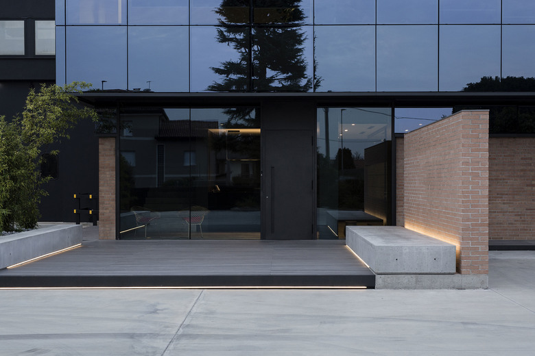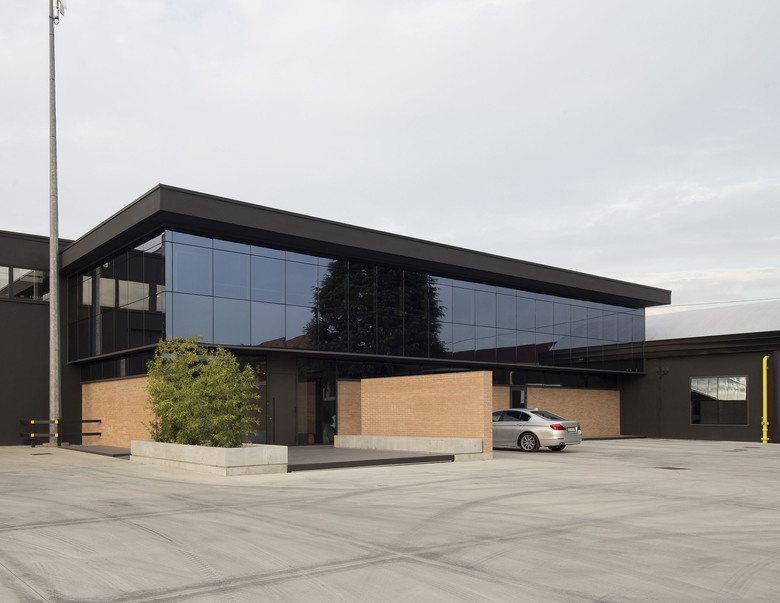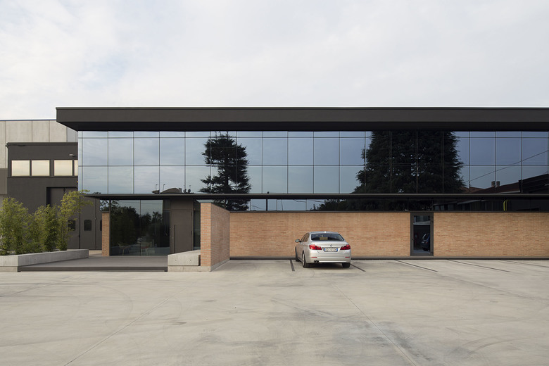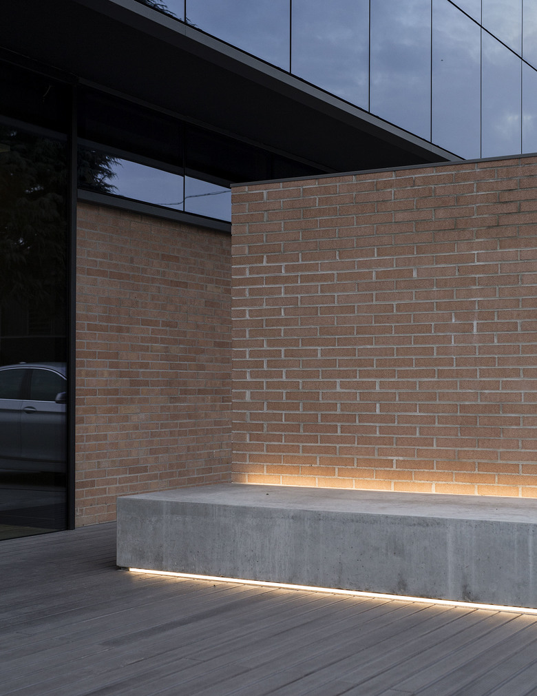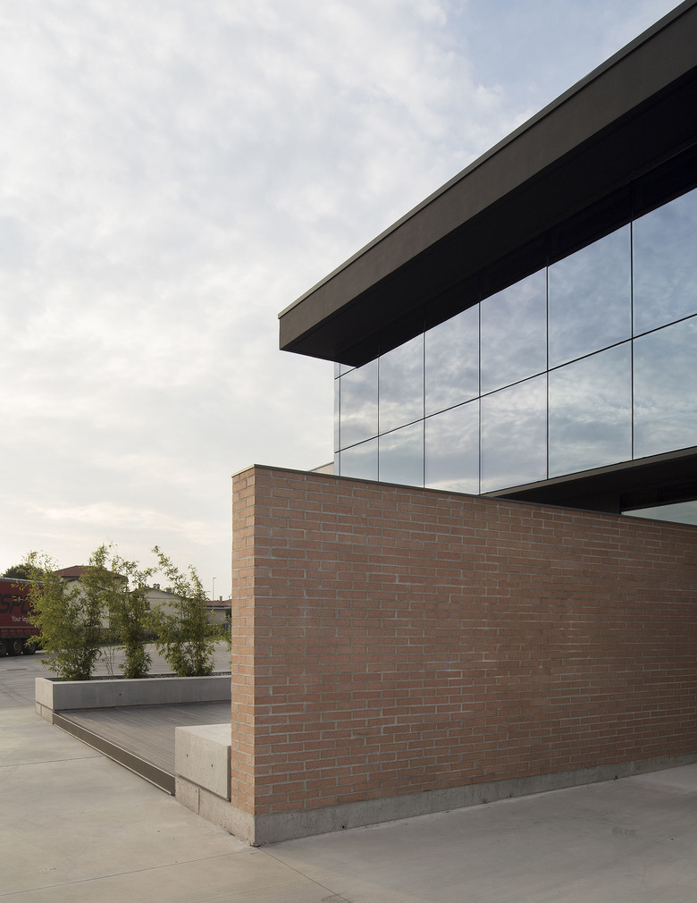 Progetto per il restyling della facciata e del nuovo ingresso di un edificio per uffici aziendali collocato tra le province di Vicenza e Treviso. La facciata principale del corpo di fabbrica necessitava di un restyling che comunicasse un’immagine contemporanea, pur mantenendo la propria identità. Allo stesso tempo, il progetto ha conferito una gerarchia agli spazi esterni. Il nuovo ingresso, caratterizzato da una pavimentazione in continuità con la hall interna, è definito da due sedute in calcestruzzo e da un setto in mattoni che lo separa dall’area destinate alle vetture, con i parcheggi riservati.