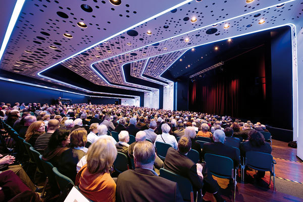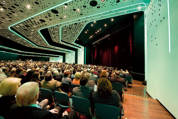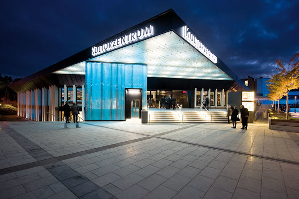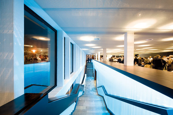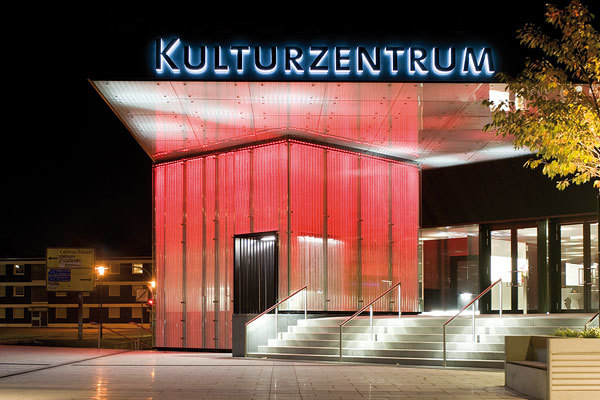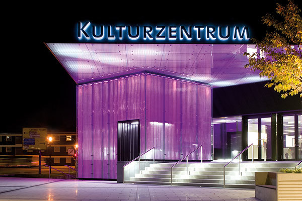 Das Gestaltungskonzept der neuen Decken- und Lichtplanung folgt einer Kreis/ Zylinderstrukur mit dynamischen Farbwechsel. Im Außenbereich umschreiben prismatische Acrylzylinder die neue Dachform. Das innovative Beleuchtungskonzept der Fassade basiert auf steuerbaren RGB LED Lichtlinen, die im Innenraum bei der Barumfassung zitiert werden.