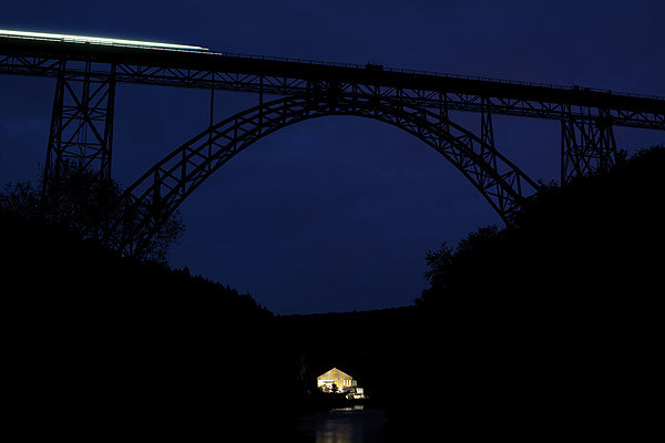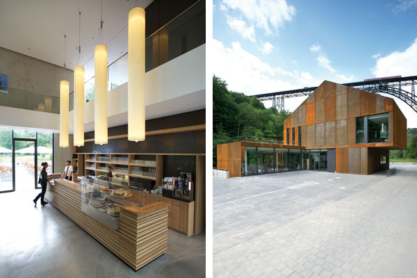 Das skulptural wirkende Haus Müngsten steht am Ufer der Wupper im Brückenpark Müngsten. Die gradlinige Architektur findet sich in den unscheinbaren Halogenstrahlern der Cafébeleuchtung wieder. Der offene Raum bietet einen wunderbaren Blick in das Tal. Highlight: drei Meter hohe Zylinderleuchten über dem Tresen, die beide Etagen verbinden und zugleich atmosphärisches und funktionales Licht schaffen. Nachts wird die Fassade durch weiches Licht beleuchtet, welches das Gebäude in seiner Einfachheit darstellt, ohne die nächtliche Umgebung zu stören.