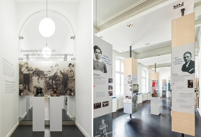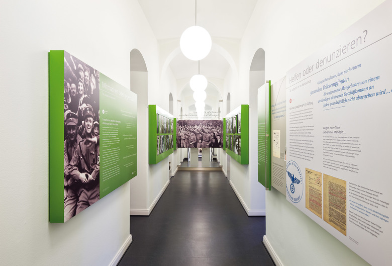 Paarweise angeordnete Downlights in abgehangenen Deckensegeln unterstützen gezielt das Ausstellungskonzept. Eine dreh-, schwenk-, dimm- und fokussierbare LED-Linsentechnik mit einem guten Farbwiedergabeindex ermöglichen einen szenografisch variablen Umgang mit dem Licht, immer in Korrespondenz mit dem Ausstellungsobjekt.