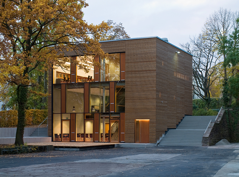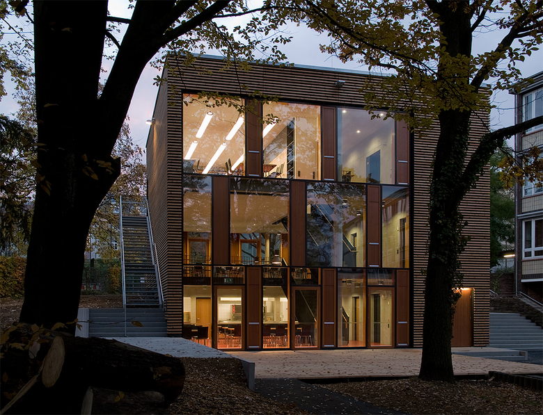 An der Nahtstelle zwischen zwei höhenversetzten Pausenhöfen ist das Schülerhaus als leicht gedrehter Solitär eingestellt. Die Form des Würfels steht in spannungsreichem Gegensatz zum langgestreckten Baukörper des Schulhauses. Die eigenständige Bauform unterstreicht die unabhängige Nutzung des Schülerhauses, das als temporäres Zuhause für Schüler gesehen wird, die ganztags auf dem Schulgelände leben, arbeiten und ihre Freizeit verbringen. Drei Ebenen bilden die drei Funktionen des Hauses ab: Mittagstisch unten, Chillen in der Mitte, Hausaufgaben oben, verbunden durch eine offene Treppe. Wände und Decken sind in Sichtbeton ausgeführt, die Außenwände mit horizontalen Holzlattung geschützt. Geschossübergreifenden Verglasungen öffnen sich zu den beiden Pausenhöfen. Dank rigoroser Beschränkung auf das Notwendigste konnte das knapp bemessene Baubudget eingehalten werden.