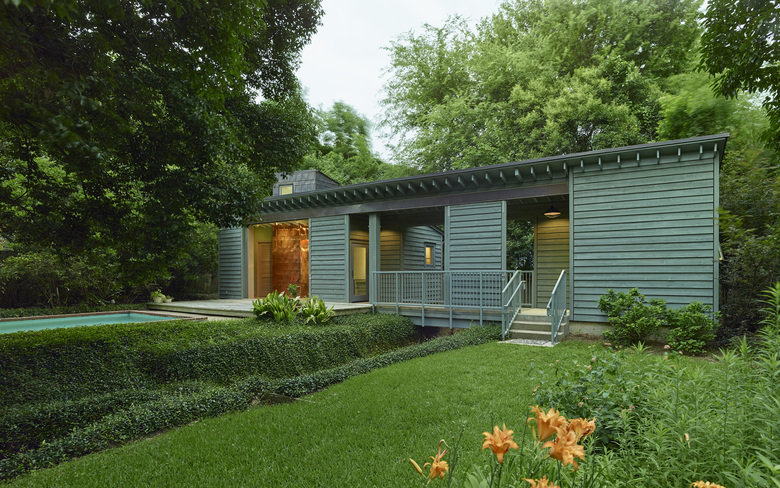 The architect’s solution was to follow the historic tradition of neighborhood back buildings but instead of three building projects, they united all three programs into one building. The solution includes a pool house, bridge, and garden shed linked to accomplish the owner goals. In order to transform the pool house into an open sitting area opposite the pool, large barn doors open and fully and move over the creek and cover the bridge adding privacy to the back yard when the owners are using the pool and pool house. The copper clad shower structure anchors the composition and provides a “hot figure”. The copper is visually hotter than the summer air, psychologically increasing the contrast and sensitively for everything cool; the greenery of the lush garden, the pool water, and the shady sitting area.