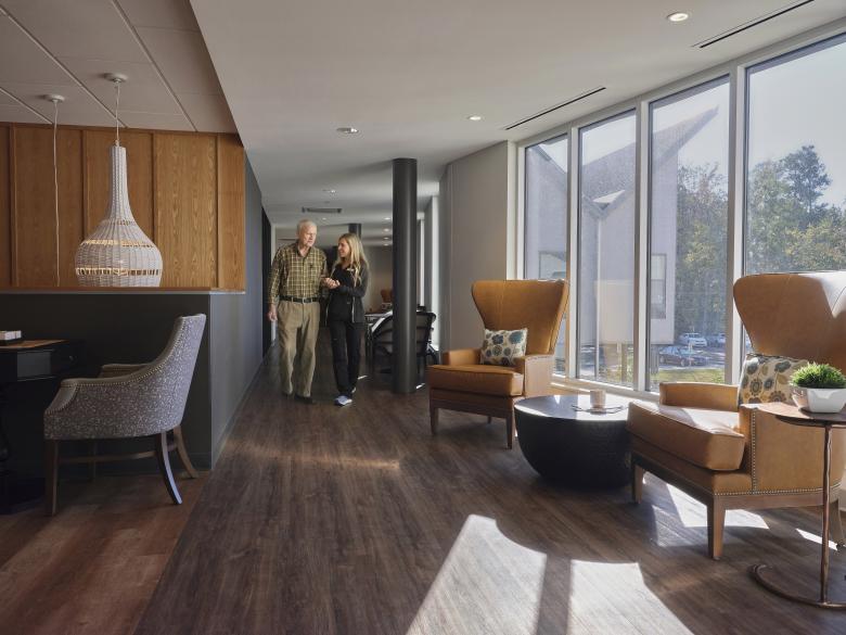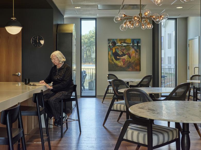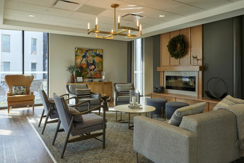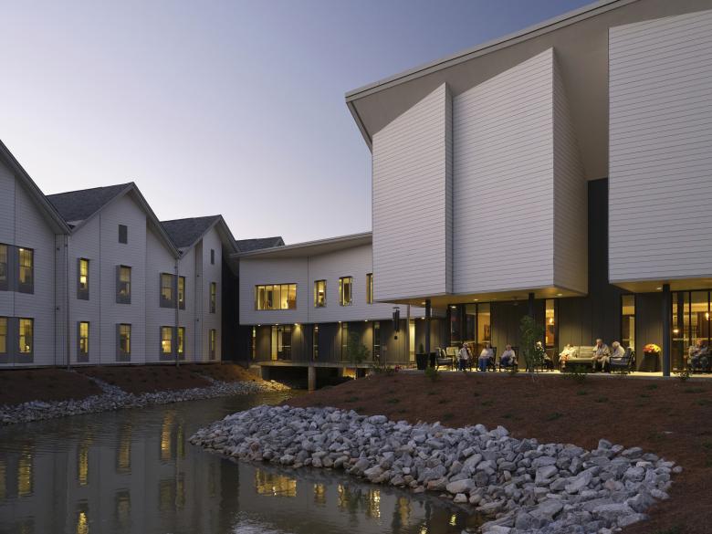 The senior living project embraces, and partially bridges a creek that runs through the site. This posture provides resident rooms with secluded landscaped views and offers vegetative filtration plantings for the stream. The bridge-building between the residential wings provides an outdoor patio, dining/café, theater, and wellness spaces for both active and passive activities. The memory care portion provides a continuous circulation route allowing the residents to always make their way home, as well as an internal landscaped courtyard for outdoor adventures within a secure environment.