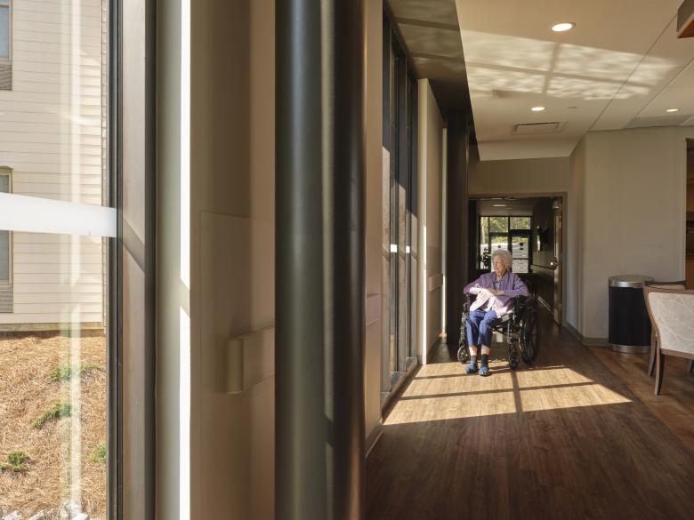 The design of the Cooperwood assisted living complex is a search for a more meaningful and lively home environment. This project did not cost any more than its competitors. The goal was to rethink the institutional typology; the materials were free, light, air, proportion, color, shape, and pattern. The project started as a reconsideration of normal units, where retiring residents would spend large portions of their day and night. The economically limited size units were reshaped to be dynamic and dimensionally open by breaking the normal four-square rooms with spayed exterior walls. The inside and out were connected with large windows strategically located to animate the interior and offer enticing views. The large institutional building was remade into houses. The shape and structure of the building, uniting the room exterior walls and houses, offered the opportunity for a dynamic balance and concurrence of formal strategies. The faceted exterior with sunshades changing in the sunlight helps this new complex feel alive and have both a familiar and unfamiliar presence, which the designers considered an example of uncanny form.