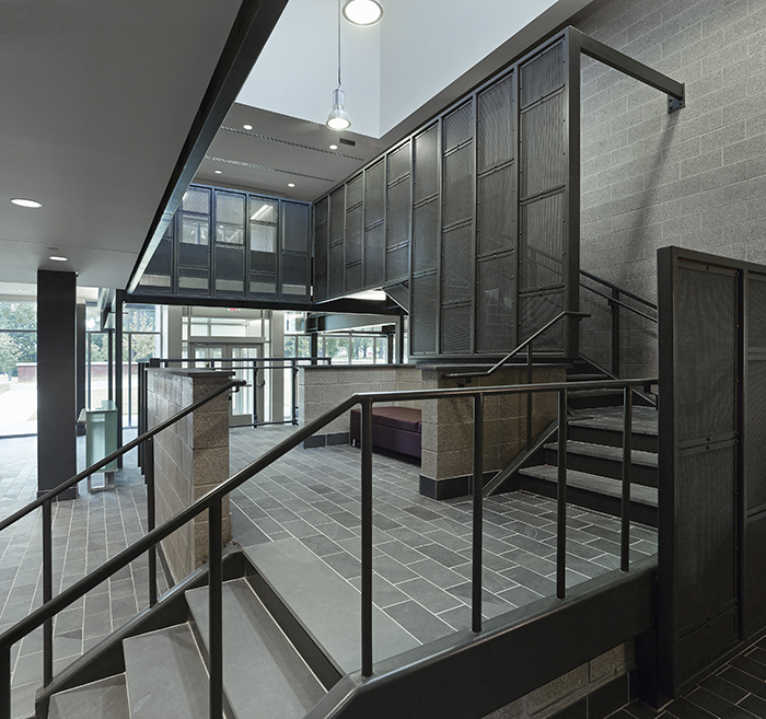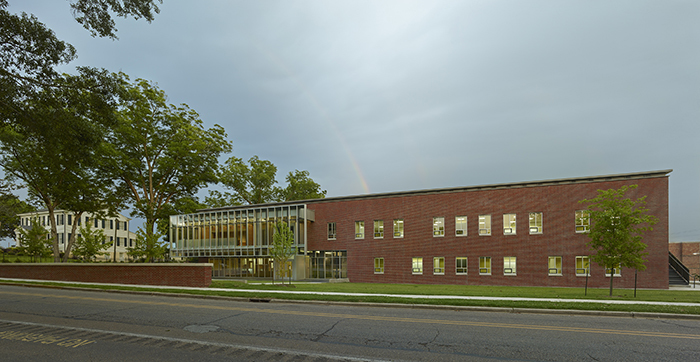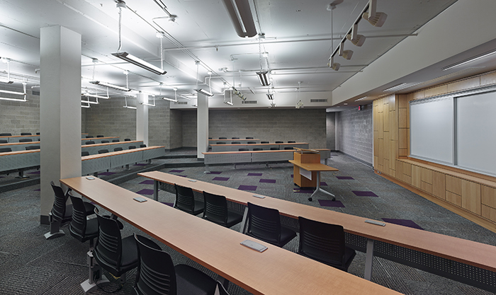 The program called for the demolition of Dumas Hall and a replacement building on the same site to serve as the home for the Business School. However, after a careful program-plan effort and forensic evaluation of the existing building, it was determined that, while most of the buildings systems and enclosure had failed, the concrete frame structure was stable and valuable. By saving the structure and rebuilding on and around it, the project saved a significant amount of funds as well as four months of construction duration. This single decision allowed for the design of a durable, energy efficient new classroom building within the funds available. The envelope and attic provides a vented architectural umbrella to reduce external heat gain and a fully baffled pressure-equalized brick veneer rainscreen exterior wall system.