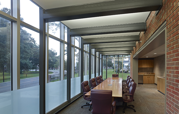 The new building now serves both the undergraduate business program and other academic classes and meetings. The new cantilevered-porch conference room has become the most desired meeting space on campus.T