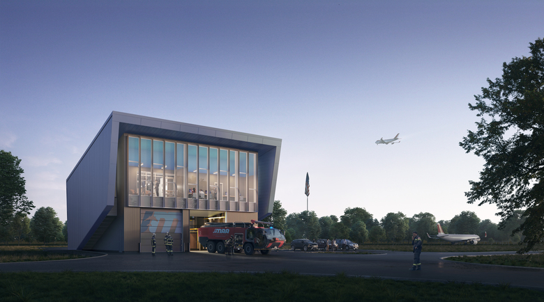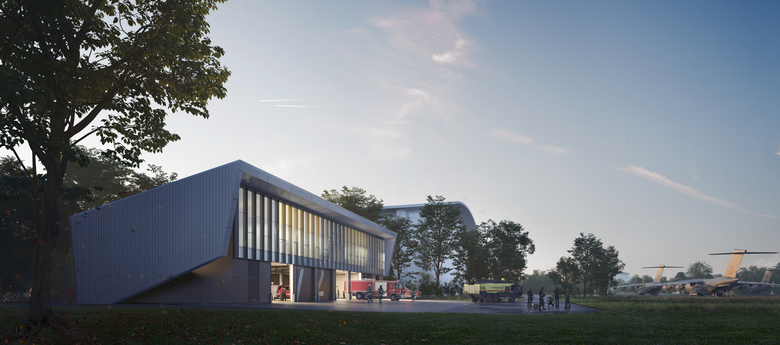 The project includes Main and Satellite Fire Crash and Rescue Stations to support emergency response for the Air National Guard 172nd Airlift Wing and the Jackson-Medgar Wiley Evers International Airport. Designed as a pair, the structure and details of the buildings are shared for efficient construction and to create a family of service buildings. An outer wing-like roof and wall enclosure is poised over the building to both protect and evoke potential movement – as firefighters are always poised to respond.
