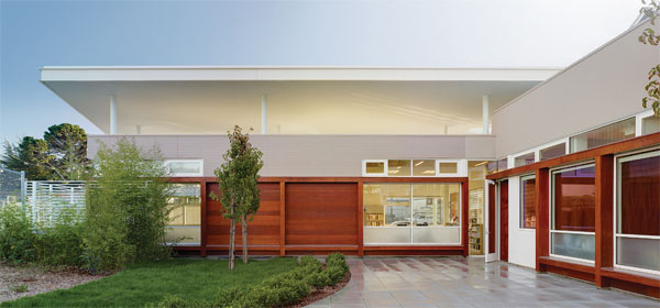 The most striking element of the front façade, positioned prominently at the corner, is an egg-shaped children's reading room with a large, bench-seat window that puts its user's activities on display and encourages use of the library by younger patrons. The children's room is capped by a high canopy roof, extending over the entry and the lower community room volume along Ocean Avenue. This roof strengthens the civic presence of the one-story structure, given the context of taller adjacent buildings. Its sky-blue underside is up-lit, providing unobtrusive security lighting to the entry and sidewalk below, while the height of the canopy is designed to optimize future photovoltaic panels.