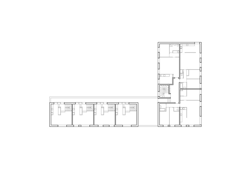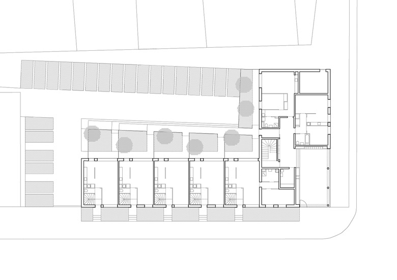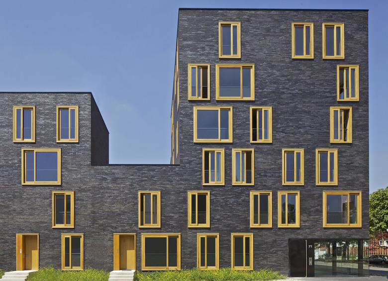 The project is situated in the district of Mont-Liébaut, in the outskirts of Béthune, in a district registered on the program of the National Agency for the Urban Renovation (ANRU). This project groups together 23 ‘semi-collective’ social housing units. The inspiration for the design came from research into new qualities developed at the interface between the individual and the collective: a sustainable lifestyle combined with the advantages of individual housing. We tried to create a unique building with very different typologies: individual housing with garden, penthouse duplex with shared terrace, apartment with garden on the groundfloor and panoramic dwellings, ranging from the simplex to the triplex, with terraces offering views of the Belfry of Béthune and over coal tips to the Horizon.The building is located at the angle of two urban axes, boulevard de Hollande and boulevard de Varsovie. To put in coherence the public place, it respects the alignments on street and marks the angle by an extra height. It presents cuts which give rythm to the facade and create private and shared terraces. Five “running through” duplex houses in the groundfloor, and four duplex on a passageway in the 2nd floor take place as individual houses along the boulevard de Hollande. Along the boulevard de Varsovie take place “collective dwellings”, multi-directed simplex up to the 2nd floor and five triplex apartments with double-heights in the highest floors.