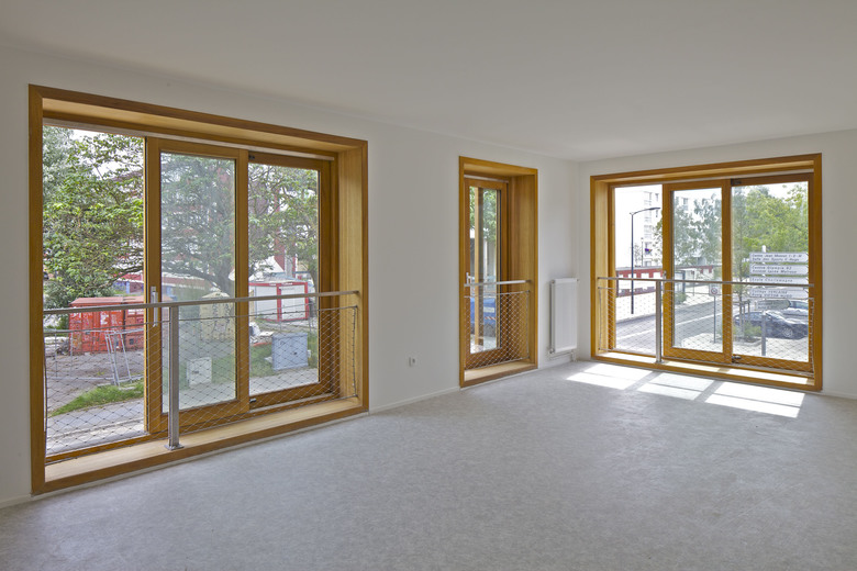 We attentively drawn the “entrance” sequences. The groundfloor dwellings are slightly above the level of the street to protect a certain intimacy. It is used as a pretext to create a small landscape project in the courtyard. The front doors of individual houses integrate bells and mailboxes while assuming the protective function of canopies. Elements are subtlely graded from public to private : parking, staircases, joineries... The hall receives specific treatments as many qualitative common spaces are crossed to arrive ‘at home’.Windows and bricks have been drawn and built with concern. Facades are insolated double walls, concrete-insolation-brick. The sliding joineries are made of movingui. They are maintained in overhang of the facades by massive wooden pre-frames fixed to the concrete wall. Every joinery constitutes a space in itself. Their projection towards the outside allows to enlarge the space of the dwellings and to animate facades with the movement of shadows. The wide proportion of glass surface and the use of light railings allow to propose particularly bright and qualitative appartements.