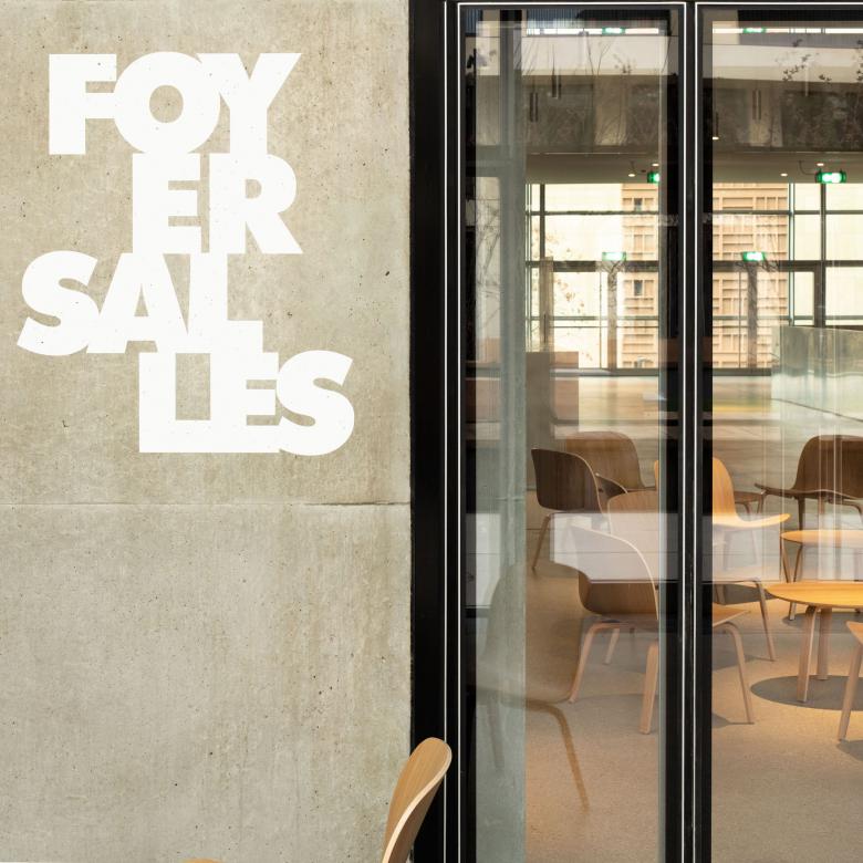 The lobby space, generous and transparent, creates links between the inside and the outside, and expresses the theater's opening to the city. The crossing foyer gives access to the two halls, and creates another link between the two public spaces that surround the building.