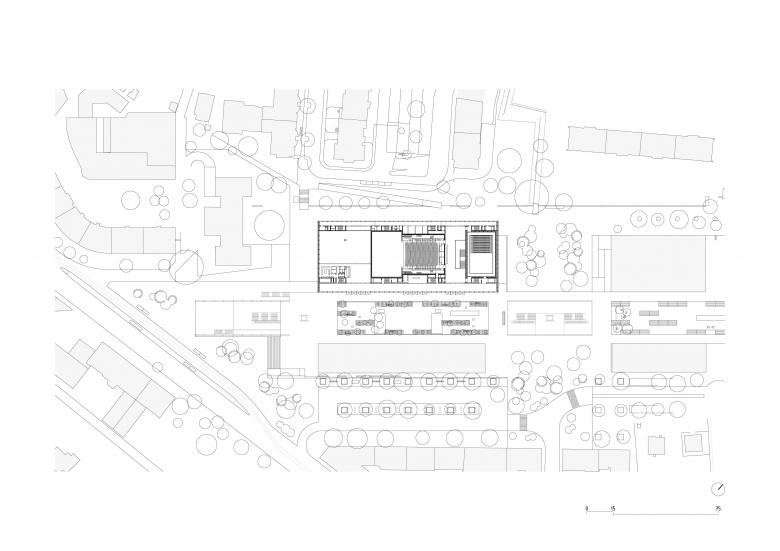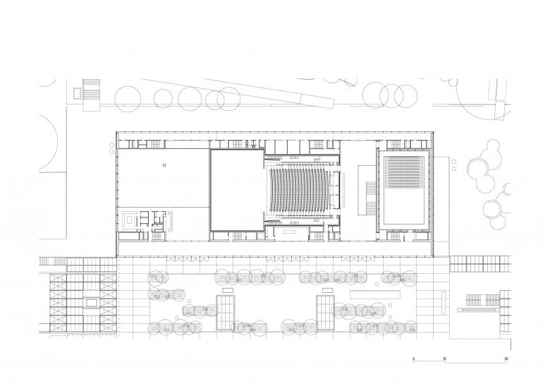 Where classical theaters distinguish the stage tower as the central element of the building's composition, the characteristic crenellated profile of the project expresses the multiplicity of activities taking place in the new theater.