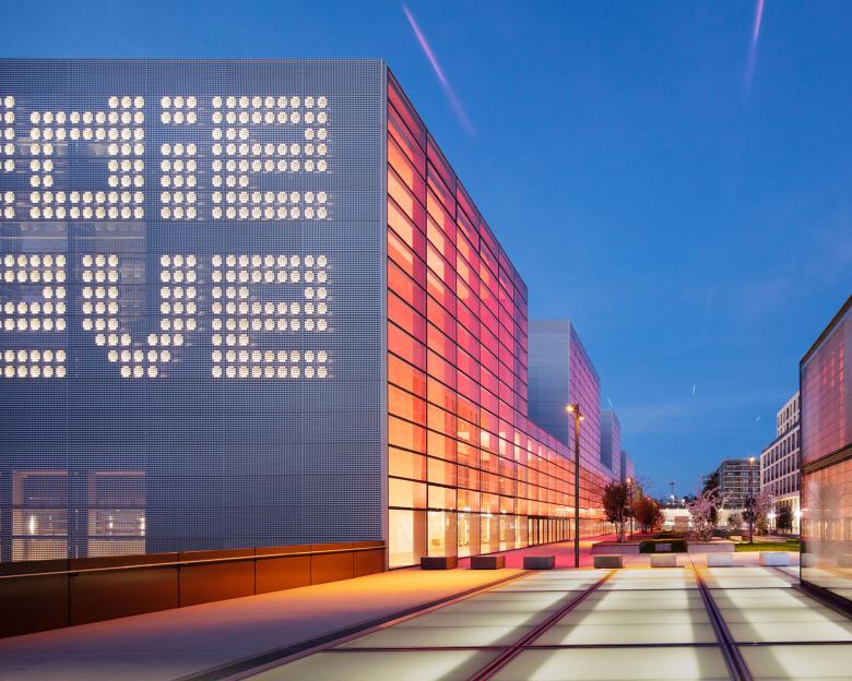 The architecture, discreet and neutral during the day, expresses the character of a place of creation and production. In the evening, a light staging transforms the building in a performance place, affirming its presence in the city, and inviting the public to the magic of the show.