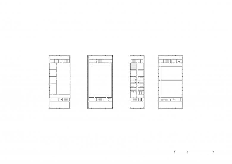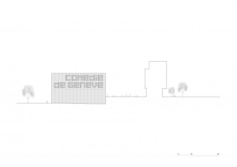 The project places the performance halls at the heart of the volume, with an articulation of the programs that generates a unique cross-section, thus giving the building its identity. Circulation spaces, public and private, are located on the façades surrounding the programs to which they give access.
