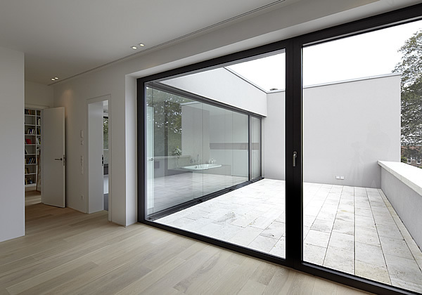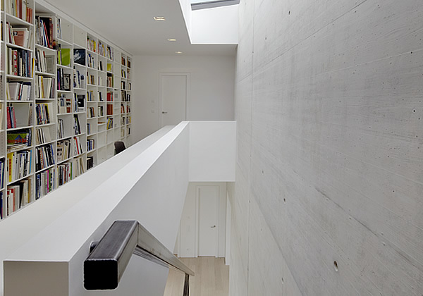 Sämtliche Räume gruppieren sich um eine das Haus stabilisierende in Sichtbeton gehaltene Wandscheibe, die über alle Geschosse reicht und gleichzeitig auch als Treppenwange fungiert.