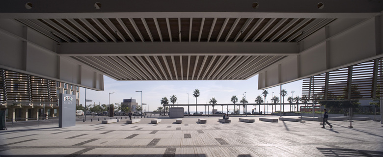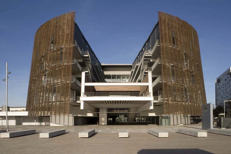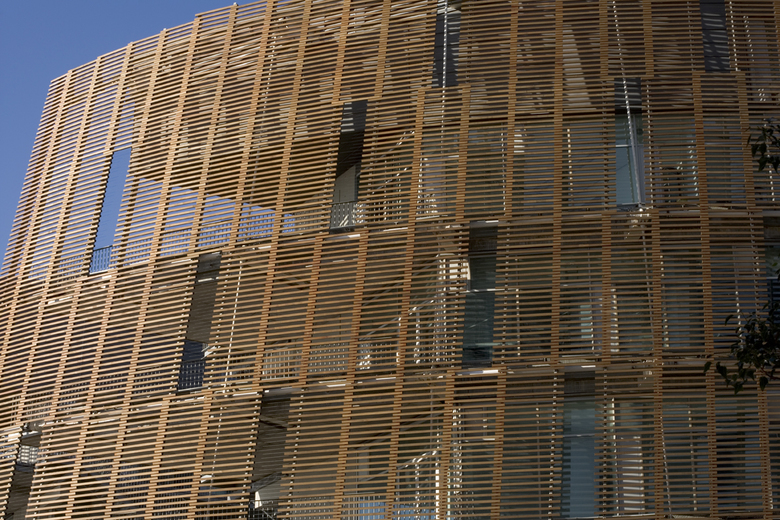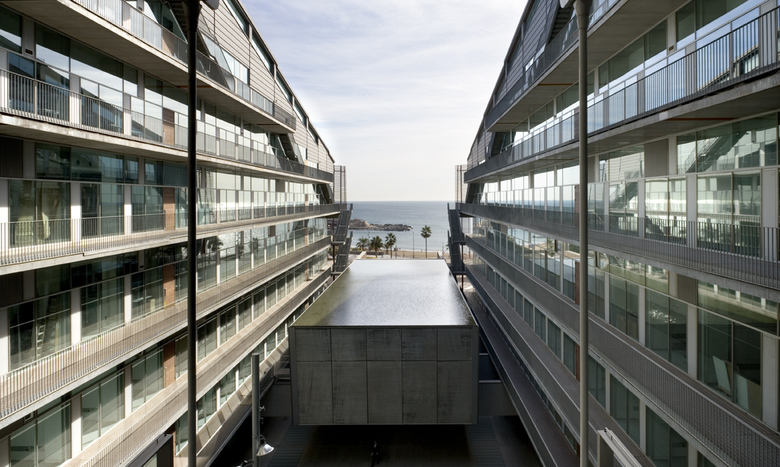 Se integra en el frente marítimo de Barcelona con una forma troncocónica, escalonado hacia el mar, levantándose hacia la ciudad y adaptado a los edificios del frente marítimo. La fachada de madera natural da ligereza al conjunto. El interior del edificio se vacía, creando una realidad independiente del entorno, que enmarca las vistas al mar y permite regular el asoleo.