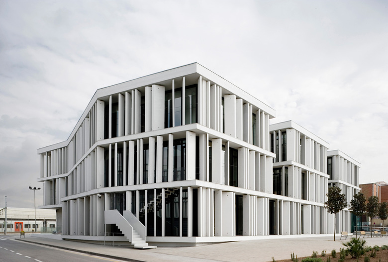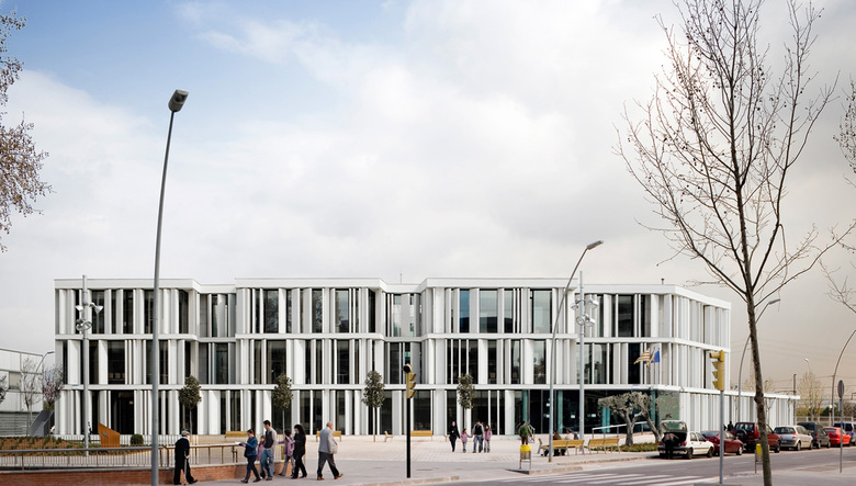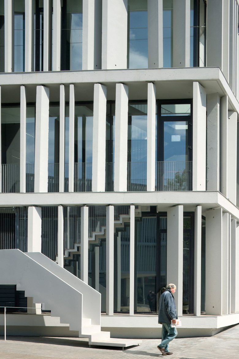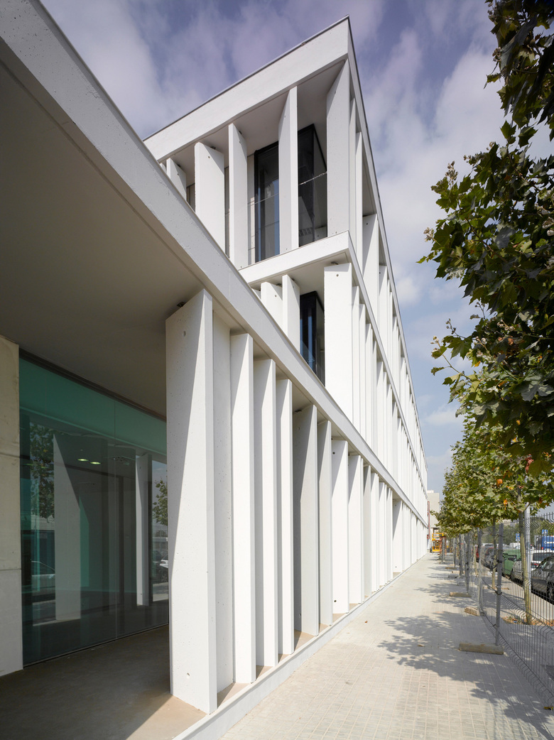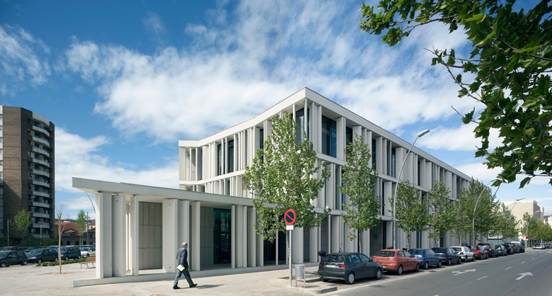 Un sencillo esquema de tres barras con las oficinas judiciales separadas por patios sobre un zócalo queda desdibujado al aplicar una piel uniforme de lamas verticales de hormigón que otorgan al edificio un aspecto tornasolado, opaco en escorzo y transparente desde el interior.