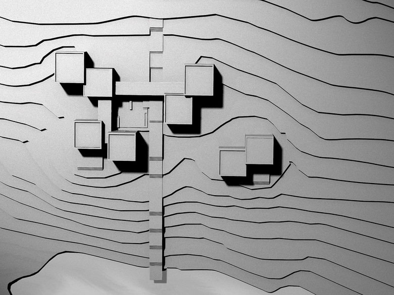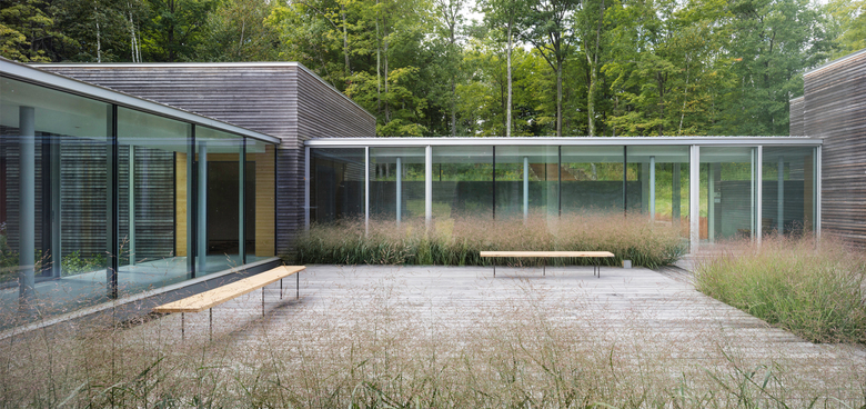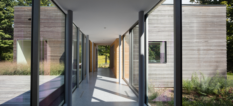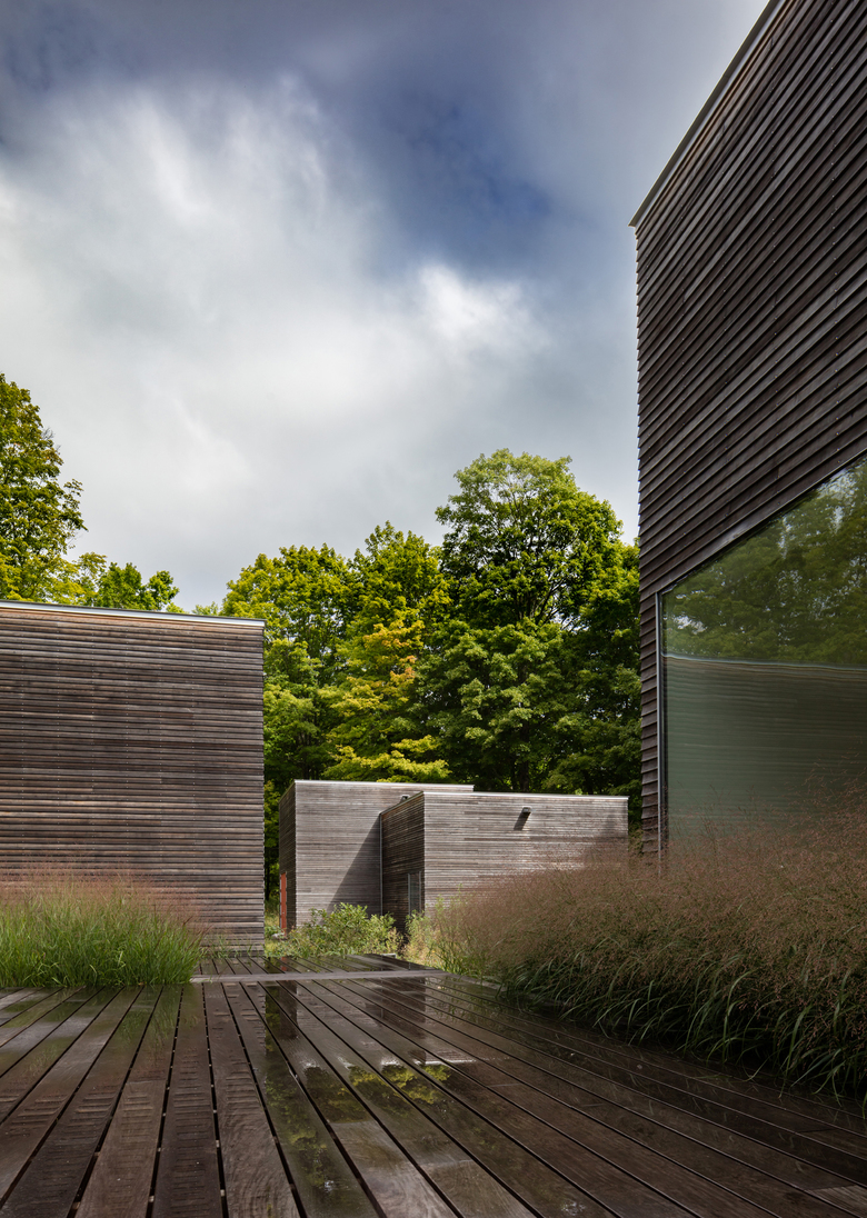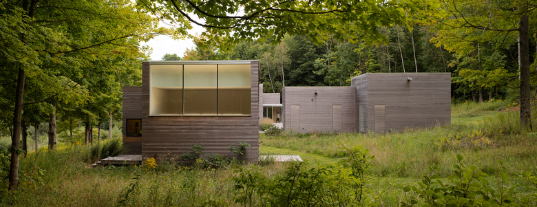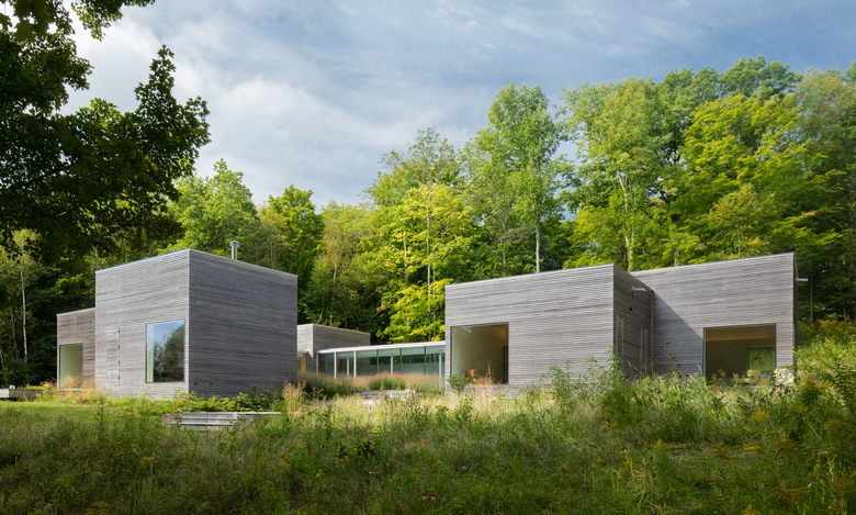 Located in a land conservancy, a collection of wood-clad cubes orient toward a pond at the bottom of a sloped site. These eight forms touch the ground lightly and follow the topography of the land, linked by glass enclosed hallways. Their simple shapes are strong silhouettes in an agricultural landscape, organized in a shifting grid akin to agricultural plots in the area. The slatted weathered hemlock cladding is a nod to the utilitarian barn structures that dot the local landscape.