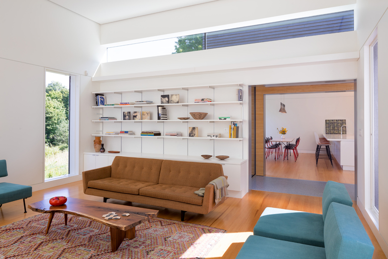 From the drive approach, the house gives little away, solid and almost bunker-like with entry flanked by a concrete wall and high clerestory. Entering through a glass “bridge” allows a glimpse of the pond beyond. Designed as a remote working studio for a photographer, the single room structures are divided by function—live, work, sleep. A detached pair of cubes houses a photography studio and darkroom. Living, dining and bedrooms comprise another cluster, centered around a shared outdoor space. There is a porosity to the interior world of this retreat. Glass hallways link the boxes and transform into open air bridges. Full-height picture windows and ventilation openings align for expansive views to the landscape. The result is privacy between the different programmatic elements in each cube, with a visual layering of space as the land is slowly revealed.