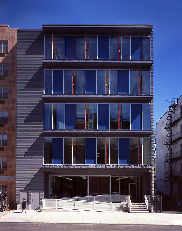 For the past five decades, Little Sisters of the Assumption Family Health Service provided a variety of public services to the East Harlem community from five separate buildings. The new building was designed to consolidate these programs. The façade of the building is made up of an ordinary exterior door system, large pieces of fixed glass and insulated panels.