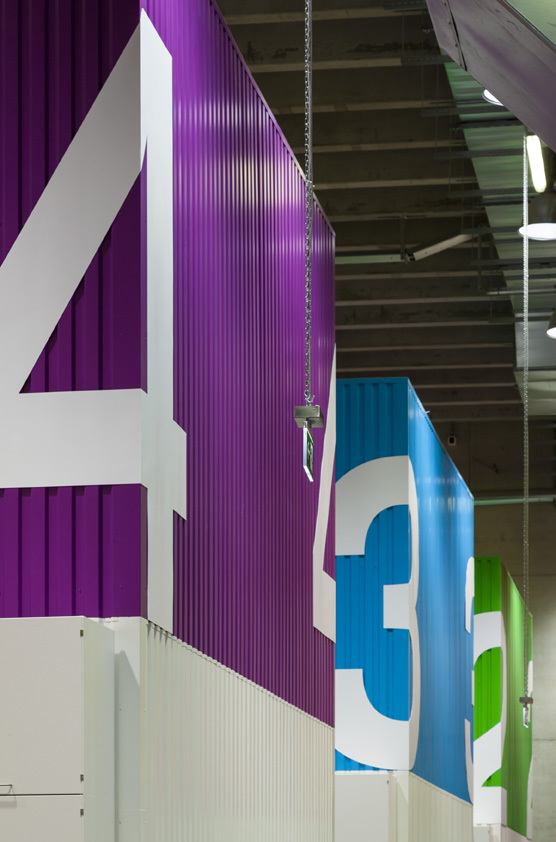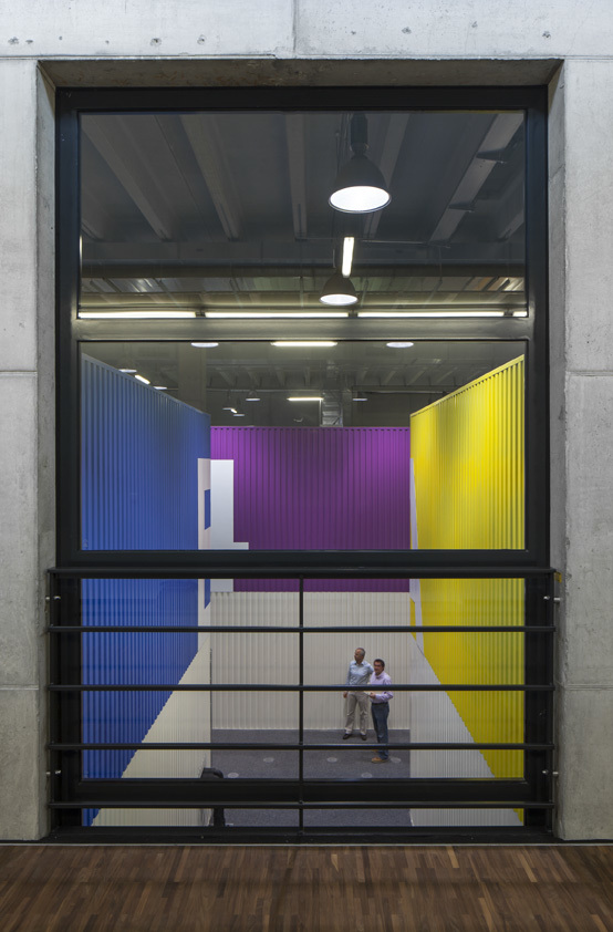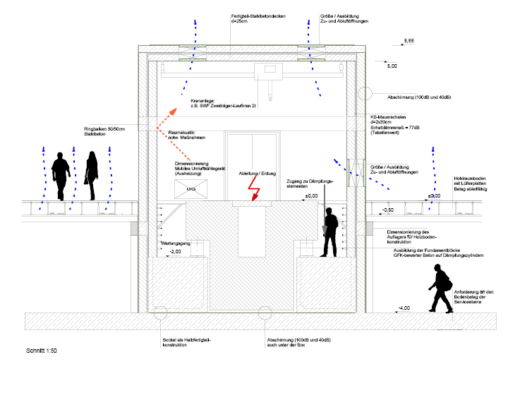 Wie die Strukturen von Festkörpern ihre elektrischen, mechanischen oder magnetischen Eigenschaften beeinflussen, wollen die Wissenschaftler am Max-Planck-Institut verstehen. Präzisionsexperimente an einzelnen Atomen, Molekülen und künstlichen Quantenstrukturen bei tiefsten Temperaturen und hohen Magnetfeldern liefern die Grundlagen für die Informationstechnologie von übermorgen. Daraus ergeben sich höchste Anforderungen an die Planung und Ausführung des Gebäudes, vor allem Akustik, Elektromagnetismus und Baudynamik beeinflussen die Konstruktion maßgeblich. Bestimmende Elemente in der rund 15 Meter hohen Halle sind die elf farbigen Versuchsboxen, die als monolithische Blöcke im Hallenraum stehen. Jedes dieser Einzellabore ruht auf einem eigenen massiven Fundamentblock, der zur Vermeidung von Kriech- und Wirbelströmen mit nicht leitenden und nicht magnetisierbarer Glasfaser bewehrt wurde. Die geplanten Experimente mit subatomarer Präzision erfordern eine stringente Abschirmung gegen äußere seismische, akustische und elektromagnetische Störungen. Jedes Fundament mit einer Dicke von rund drei Metern ruht auf Luftfedern zur Schwingungsentkopplung des Experiments von der Umwelt.