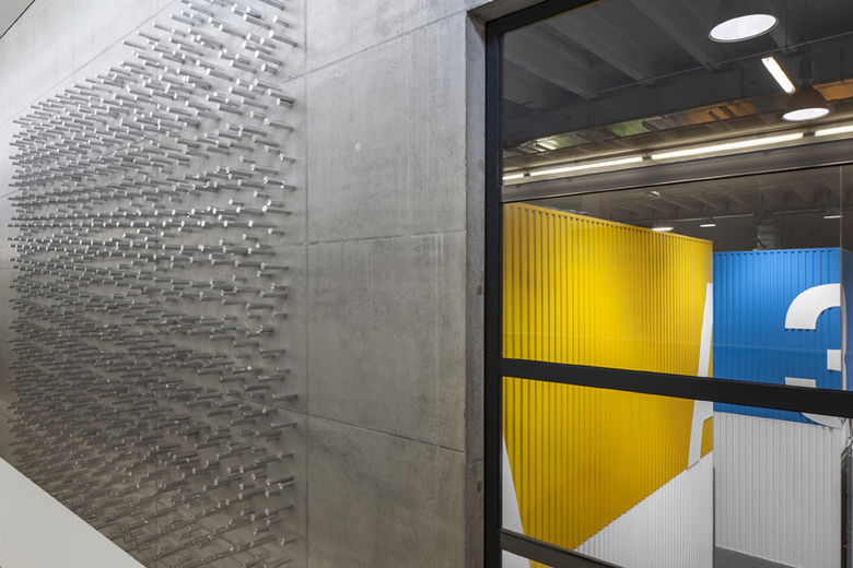 Durch die exponierte Lage in der Parkanlage kommt der Gestaltung der Hallenfassade eine besondere Bedeutung zu. Die Versuchshalle ist mit einer Haut aus vertikalen Aluminiumprofilen umhüllt, die in unterschiedlichen Abständen und auf zwei Ebenen angebracht sind. Dadurch ergeben sich Interferenzmuster, die sich je nach Betrachtungswinkel und -abstand ändern. „Die Gestaltung der Hülle reflektiert unser neu gewonnenes Verständnis für die Experimente an der Grenze des technisch Machbaren und verweist auf ihren Inhalt. In den Experimenten nimmt die Erkenntnis durch hochpräzise Annäherung an die Oberflächen zu. Unsere Wahrnehmung und unser Bild ändern sich, ohne dass sich das Material ändert. Diese Korrespondenz und Versinnbildlichung der Forschungsinhalte hat uns als Basis für eine kraftvolle und eigenständige Gestaltfindung interessiert“, erläutert Markus Hammes von hammeskrause architekten.