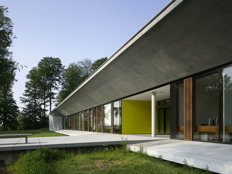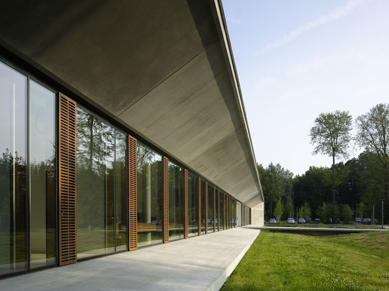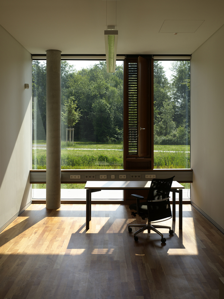 Hier können Tumore von Krebspatienten ambulant mit Protonen und Schwerionen bestrahlt werden. Die Besonderheit ist die Koordination eines Linearbeschleunigers, eines Synchrotrons und einer Strahlführung hin zu den Räumen, in denen über Roboter die Patienten vor dem Ionenstrahl positioniert werden. Die Perspektive des Patienten einnehmend, wollten wir diese technischen Elemente soweit als möglich aus seinem Blickfeld rücken. Mit einer fast übergroßen Geste der Offenheit wird der Patient empfangen. Die Gebäudeseite, an der der Haupteingang liegt, ist eine einzige Öffnung, großzügig, weit und verglast. Durch ihre Direktheit ist sie in der Lage, die sich dahinter türmenden technischen Baukörper zu überblenden. Zudem erzeugt sie eine unverwechselbare Landmarke. Je mehr die räumliche Enge aus therapeutischen Gründen zunehmen muss, umso stärker wird mit architektonischen Mitteln der enger werdende Raum in Auflösung gebracht.