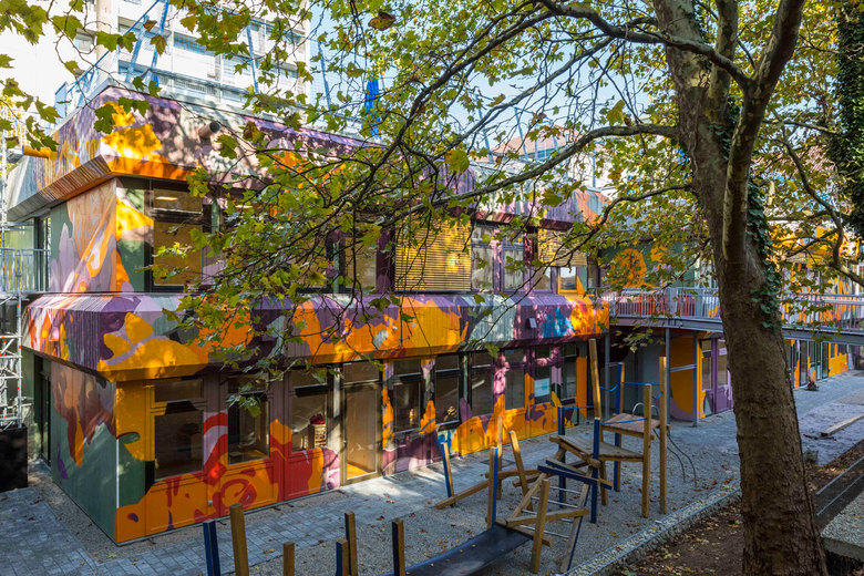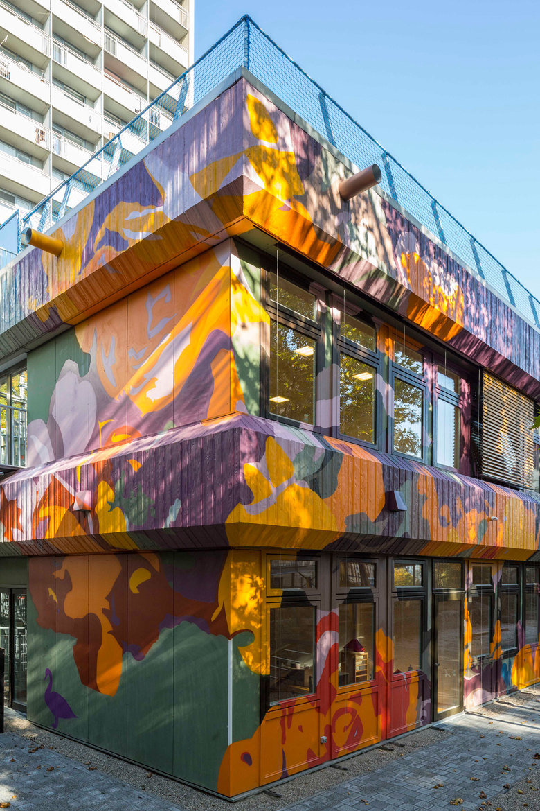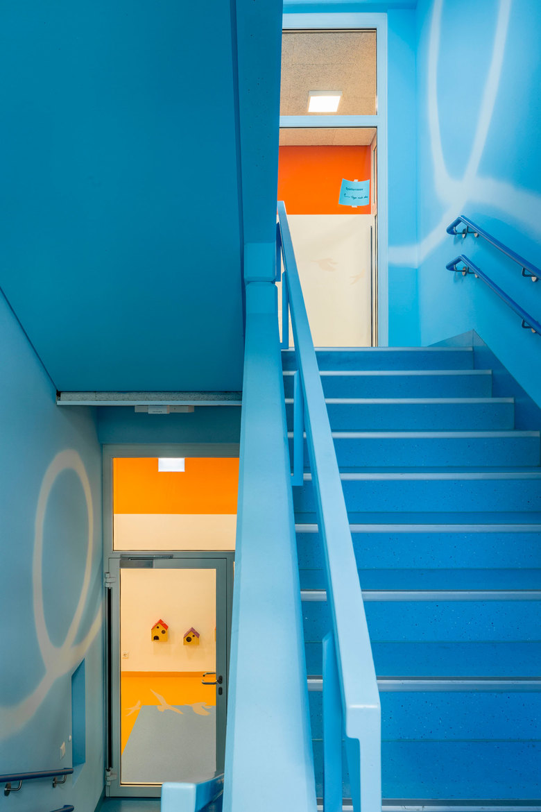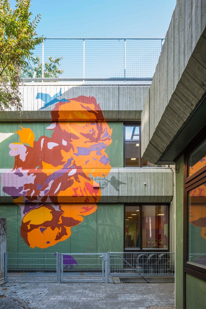 Für das Konzept der Umgestaltung arbeiteten wir mit der Stuttgarter Künstlerin Judith Brucklacher zusammen. Sie entwarf das Bild eines ausgedehnten Rosenbuschs, der den Bau überzieht und mit kraftvollen Farben zum Leuchten bringt. In seinen Blättern verbergen sich einzelne Vögel. Im Innern wird das Thema weiter fortgeführt: Die Garderoben der Kinder sind kleine Nistkästen, die Sitzbereiche erscheinen als Pilze, Bäume oder Baumstümpfe.