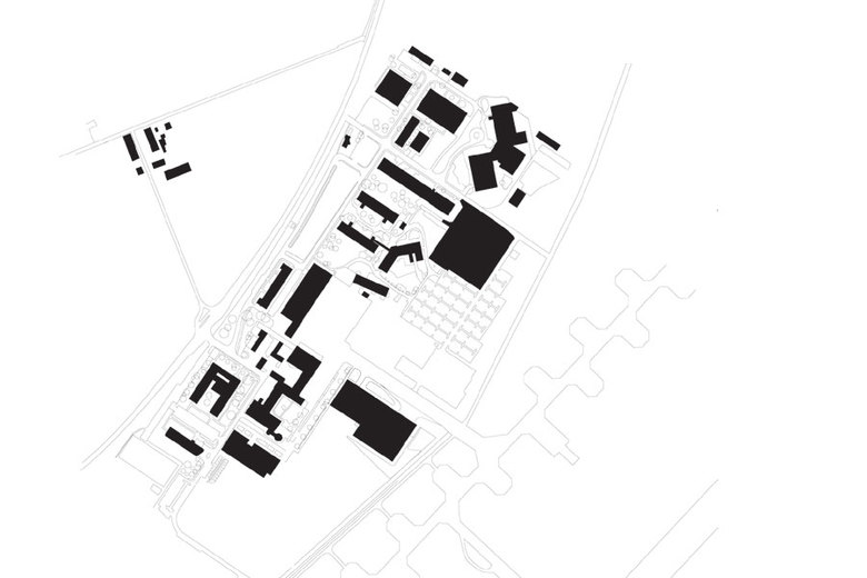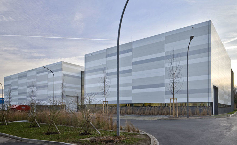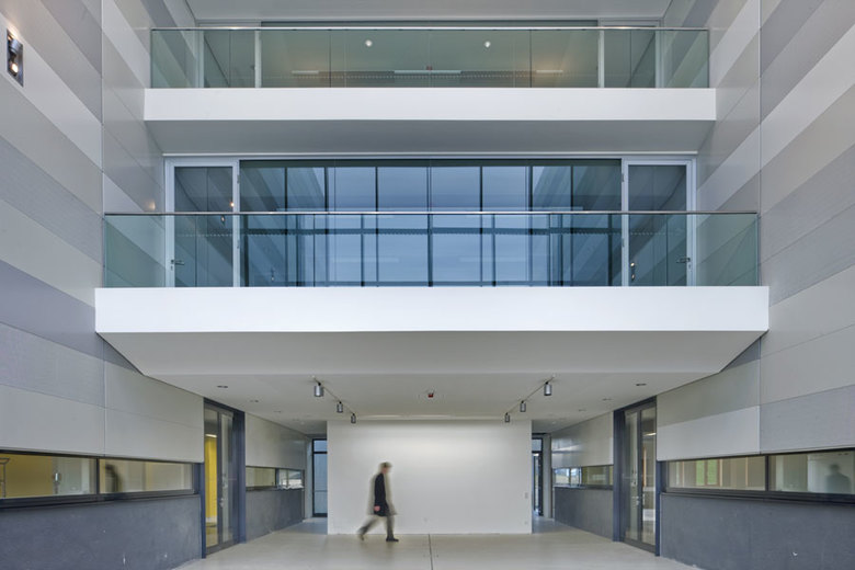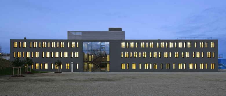 Das Forschungsgebäude führt die Institute Robotik und Mechatronik (RM) sowie Hochfrequenztechnik und Radarsysteme (HR) am Standort Oberpfaffenhofen unter einem Dach zusammen. Die Fügung und das Zusammenspiel der unterschiedlichen Funktionsbereiche und Volumina spiegeln sich in der formalen Gliederung der Fassade wider. Die Eingangsfassade ist transparent und offen gestaltet, um den Haupteingang zu markieren und durch die Zäsur die eigenständige Identität der beiden Institute zu verdeutlichen. Der mehrgeschossige Bürobaukörper bildet als dunkler Monolith einen Gegensatz zu den hellen Metallfassaden der beiden Hallenbaukörper. Die Changierung hilft, die großen Hallenvolumina mit dem menschlichen Maßstab in Beziehung zu setzen und diese in die Umgebung einzubinden. Die entstehende Fuge zwischen den beiden Materialien wird als umlaufendes Glasband formuliert, das ausschließlich in Augenhöhe Ein- und Ausblicke ermöglicht.