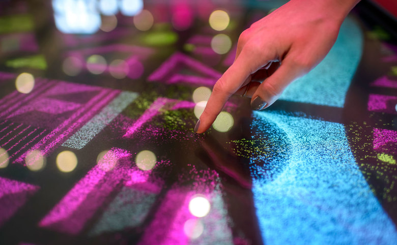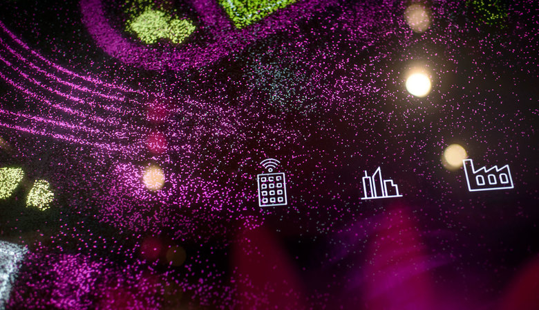 Interaktiv und im wahrsten Sinne greifbar – Multitouch kombiniert mit Objekterkennung kommt zum Einsatz, um die komplexen Zusammenhänge von Low Power Wide Area (LPWA) Networks darzustellen, die einmal die technologische Grundlage für Internet of Things (IoT)-Anwendungen bilden sollen. Die aus Partikeln bestehenden Animationen des Exponats symbolisieren die flächendeckende Sensorik auf der LPWA und damit auch das IoT basiert.