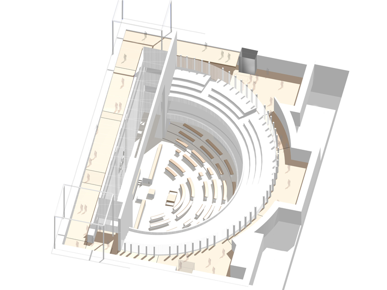 Wahrung der Authentizität des Nationalratssitzungssaales durch behutsame Intervention in den Schwellenbereichen ist ein Grundanliegen dieses Entwurfes. Die Modernität des Arbeitsmilieus resultiert aus einem entspannten Umgang mit dem Bestand. Großzügiger, leichter, schneller und ständiger Austausch mit seinem Umfeld ermöglichen fließende Raumübergänge und Adaptierung der technischen Infrastruktur auf höchstem Niveau. Man bemühte sich um die selbstverständliche Gegenwart eines stimmigen Ensembles, stimmigen Milieus, eines stimmigen Raumes im historischen Kontext.