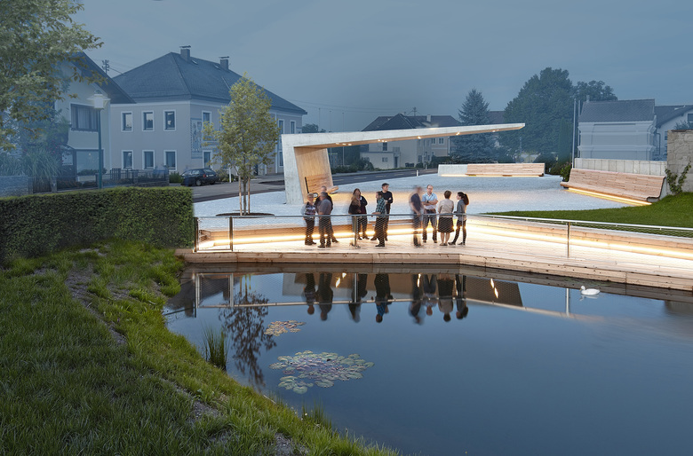 Bei einer Größe von 80 m2 und einer Auskragung von 12 m handelt es sich vermutlich um eine der größten Konstruktionen dieser Art in Österreich. Das gesamte Bauwerk ist in Sichtbeton ohne zusätzliche Verblechungen errichtet und stellt das Bindeglied zwischen der formelleren Platzzone des Kirchenplatzes und dem Teich her. Dieser weist durch das neu errichtete Holzdeck eine hohe Aufenthalts- und Naherholungsqualität auf.