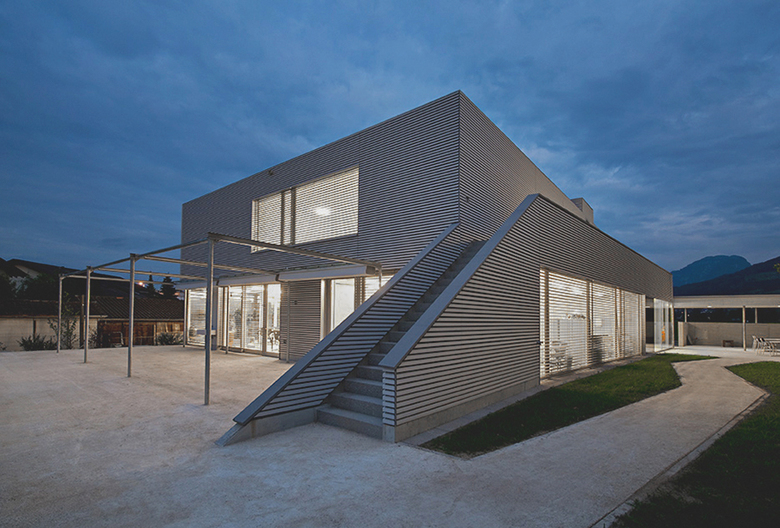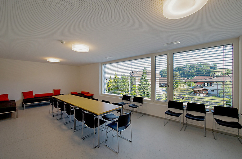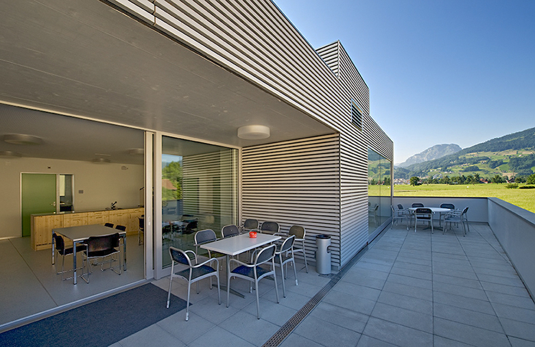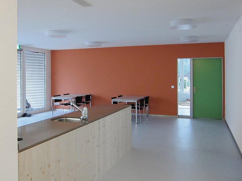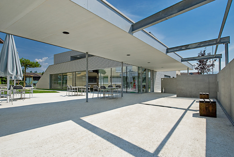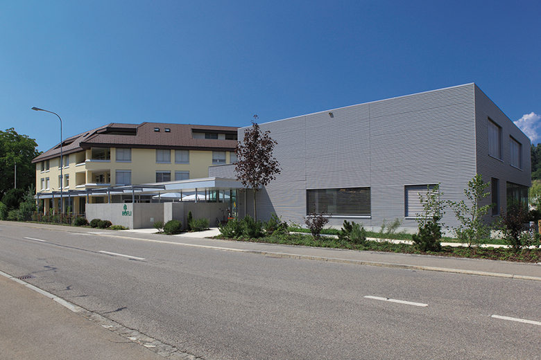 Der Neubau des zweigeschossigen Beschäftigungstraktes wird in den südöstlichen Teil des Geländes gestellt. Das zurückgesetzte Obergeschoss lässt eine Aufenthaltsterrasse frei. Die Garderoben für externe Klienten sind im Erdgeschoss angeordnet, ebenso die beiden grossen Beschäftigungsräume, die auch über einen Aussenbereich an ruhiger Lage verfügen. Der Eingangsbereich ist mit dem Obergeschoss über eine offene Treppe und einen Luftraum verbunden, der auch als Tageslichteinfall dient. Ein Verbindungsgang im UG verbindet Alt-, Neubau und Parkgarage. Die schräggestellte Erdgeschossfassade reagiert auf die diagonal verlaufende  Front des Heimbaues und erzeugt einen spannungsreichen Aussenraum. Die  daraus resultierenden perspektivischen Verkürzungen lassen optische Raumtiefen entstehen, welche die realen, eher beschränkten Platzverhältnisse überspielen. Wie eine Spange legt sich ein umlaufendes Vordach entlang der Eingangs- und der Strassenfassade um das  Wohnheim und setzt sich als Verbindungsdach fort, welches die Promenade zum Neubau  überdeckt. Mit diesem Element werden die beiden Gebäude funktionell und architektonisch miteinander verbunden.