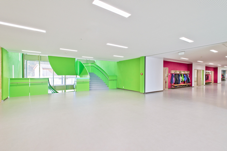 Das prägende Element des Schulhauses ist die zentrale Treppenhalle. Sie bildet den Hauptorientierungspunkt der erweiterten Schulanlage. Im Erdgeschoss sind an diese zentrale Halle, die ins Freie erweiterbare Aula und die dem Schulbetrieb zudienenden Räume untergebracht. Die oberen Geschosse werden von den Klassenclustern dominiert. Jeweils vier Klassen bilden mit zwei Gruppenräumen ein Cluster.