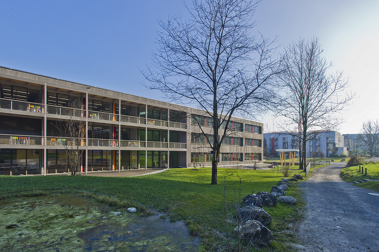 Die bestehende Schulanlage wurde in Richtung Norden durch einen Ergänzungsbau erweitert. Er schliesst direkt an das bestehende Schulhaus an und schafft auf jedem Geschoss eine direkte Verbindung zwischen Alt und Neu.