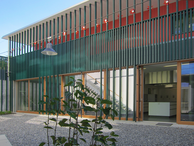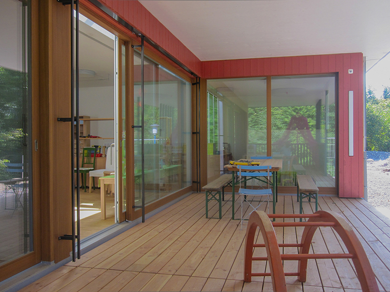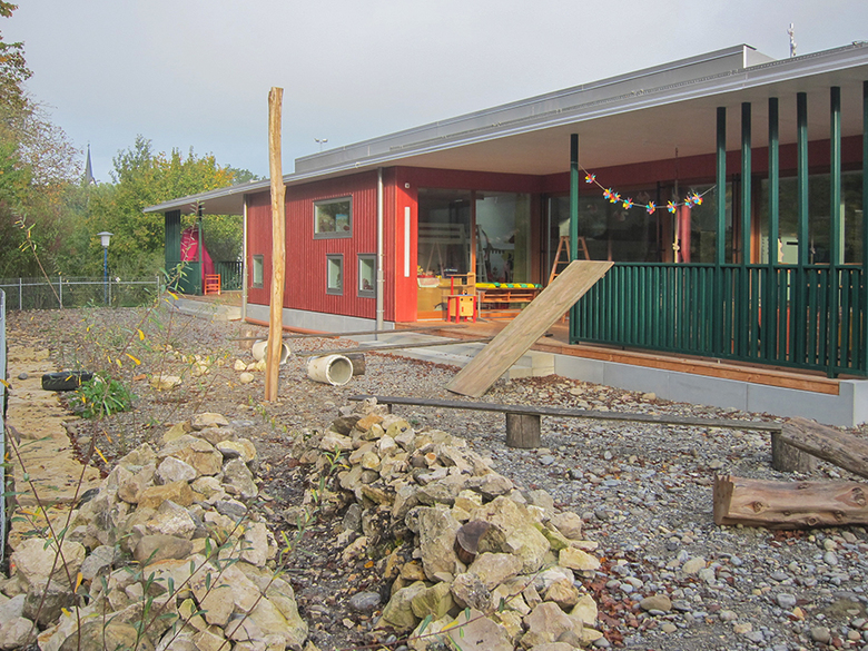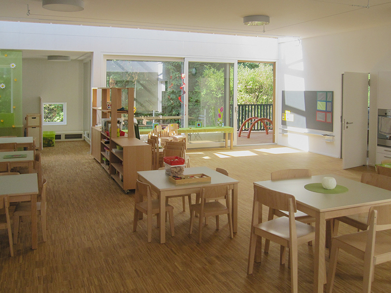 Der Zugang zum Kindergarten kann sowohl über den bestehenden Schulhausplatz als auch östlich entlang dem Oberstufentrakt verkehrsfrei erfolgen. Die Kochschule nutzt die bestehende Infrastruktur des Oberstufentrakts und wird direkt über den Lichthof erschlossen. Die Räume der Kochschule im Untergeschoss sind durch einen Verbindungsgang mit der Schule verbunden. Die raumhohen Fenster gewährleisten eine gute Belichtung. Sie orientieren sich auf zwei Lichthöfe die bei Bedarf auch als Aussenräume für die Schulküche dienen. Im Gegensatz zur "Schulorientierung" der Kochräume schauen die beiden Kindergärten südwärts gegen ein bestehendes Wäldchen, welches sich von der Hangkante zum Erzbach hinunterzieht. Zwei gedeckte Terrassen profitieren von dieser attraktiven Lage und verstärken die räumliche Wirkung. Der Kindergarten im Erdgeschoss wurde in Holzelementbauweise ausgeführt. Beim Innenausbau wurde auf eine kindergerechte Farbgebung und nachhaltige und natürliche Materialien geachtet. Im Untergeschoss wurden die Aussenwände in Sichtbeton belassen. Während sich die Schulküche in einer zurückhaltenden Farbgebung präsentiert, ist der Ess- und Theorieraum wohnlich, mit Parkettböden und dimmbarer Beleuchtung ausgestattet. Die Fassade ist im Eingangsbereich des Kindergartens mit einer leuchtroten Holzschalung und wetterseitig mit grossflächigen Platten verkleidet. Sämtliche neuen Gebäudeteile erfüllen den Minergiestandard.