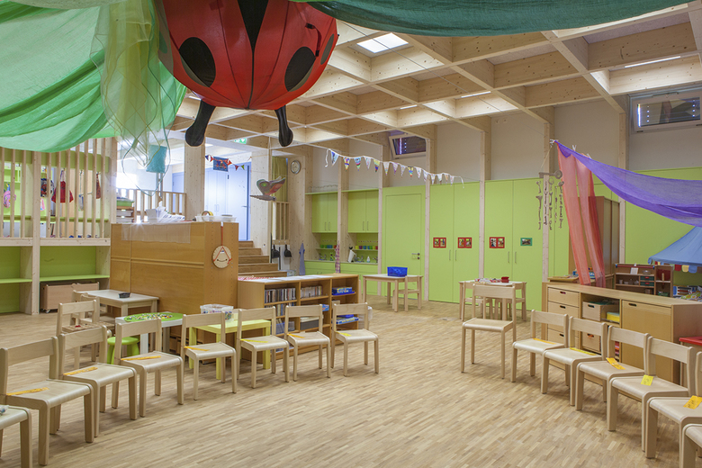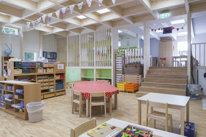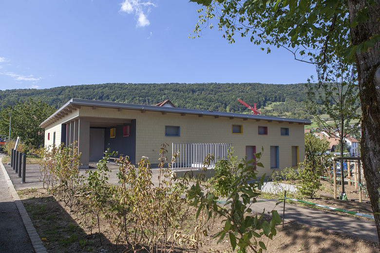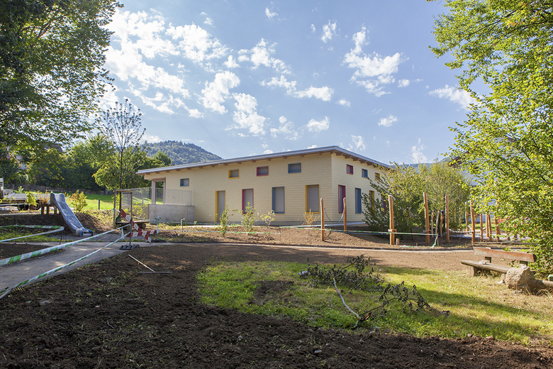 Das Gebäude ist in seiner Erscheinung, im Ausdruck und in der Materialisierung Teil der schönen Gartenanlage mit dem prächtigen Baumbestand. Die sorgsame Einfügung mit Rücksicht auf die Topographie ist ein wichtiger Bestandteil des Konzeptes. Das Gebäude ist als Gartenpavillon angedacht. Es wird integraler Bestandteil der parkähnlichen Landschaft. Die Ausstrahlung und die Identität als Haus für die Kinder werden durch die Materialisierung und die Farbgebung gestärkt.