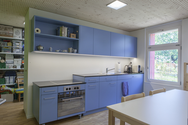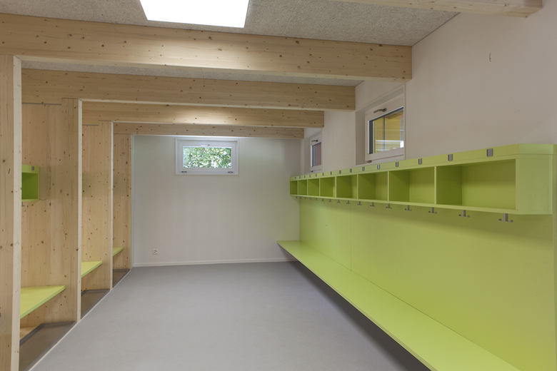 Durch das Entrée eintretende Schüler erblicken, als gute Orientierung in der Anlage, den sich vor ihnen öffnende Hauptraum und erreichen direkt flankierend die Garderoben. Vis à vis sind die WC – Anlagen die meistens im Zusammenhang mit dem Ankommen oder dem Verlassen des Hauses benutzt werden müssen. Hauswart- und Technikraum ergänzen die zudienenden Räume auf dem Eingangsniveau. Die Service-Räume für die Vorbereitungen und der Materialraum für die Lehrpersonen befinden sich auf dem tieferen Niveau wie der Hauptraum und der angrenzende separat nutzbare Gruppenraum. Die Kinder erreichen vom Entrée respektive von den Garderoben über eine bescheidene Treppe den Höhensprung auf das tiefere Niveau des Hauptraumes, das ebenerdig den Austritt in den Garten freigibt. Für Kinder oder Erwachsene mit Gehbehinderungen steht für die Überwindung der Höhendifferenz eine Hebeplattform zur Verfügung. Alle Räume sind natürlich belichtet und belüftet.