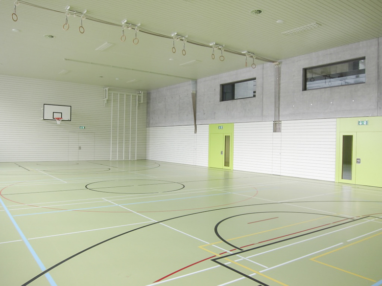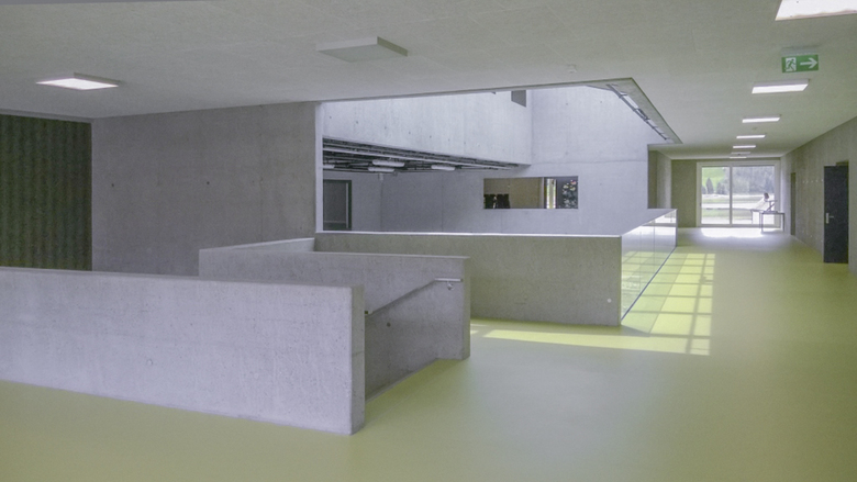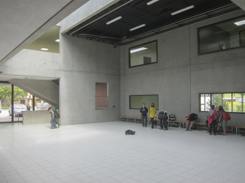 Zentrales Element des neuen Schulgebäudes ist die zweigschossige Eingangshalle. Für den Schulbetrieb dient sie als vielseitig nutzbarer Pausen- und Aufenthaltsbereich. Durch ihre Lage, kann diese Halle aber auch für verschiedenste Anlässe genutzt werden. Der Kindergarten im Erdgeschoss verfügt über einen direkten Zugang zum geschützten Aussenbereich. Im Obergeschoss befinden sich alle Räume der Schule. Die Korridore eröffnen Ausblicke auf See und Kirche. Sie bilden Nischen, die auch für Gruppenarbeiten genutzt werden können. Im Untergeschoss sind die Garderoben und Turnhalle direkt aus der Eingangshalle erreichbar.