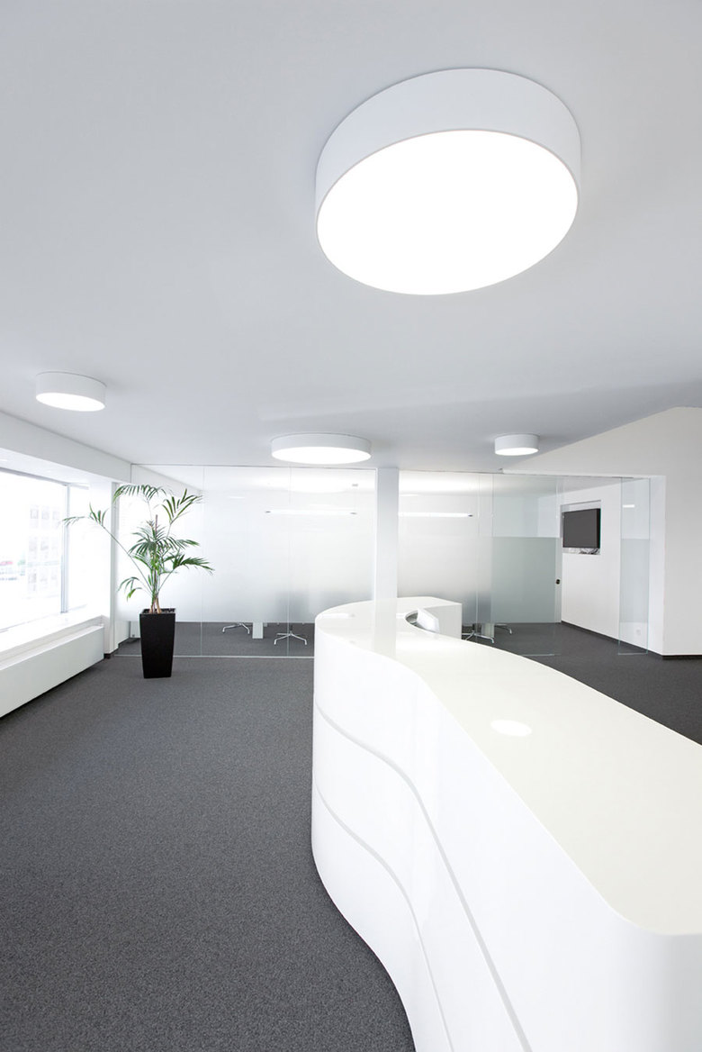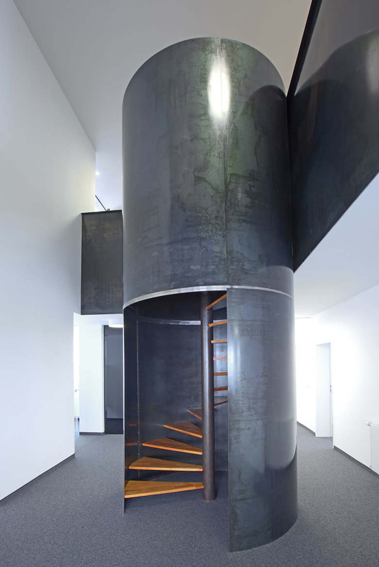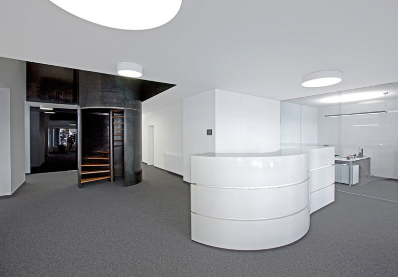 Im Eckhaus an der Kreuzung Frauenstraße/Schuhhausgasse entstand auf zwei Geschossen eine auf wenige Elemente reduzierte Arbeitswelt. Um eine möglichst freie und offene Kommunikation zwischen beiden Geschossen zu schaffen wurde ein großzügiger, rund 7 Meter hoher Luftraum integriert. Die Verbindung der beiden Ebenen erfolgt über eine Spindeltreppe, die von einer Tonne aus geöltem Schwarzblech gefasst wird. Die Freifrom stellt das zentrale Element der Arbeitswelt da. Die profillosen Glastrennelemente in den Büros sorgen für Lichtdurchflutung und die notwendige Transparenz. Die Transparenz und die weißgestrichenen Wände stehen im deutlichen Kontrast zu der in Anthrazit gehaltenen Treppe, dem Bodenbelag und dem in schwarz gestaltetem mobilen Raumteiler.