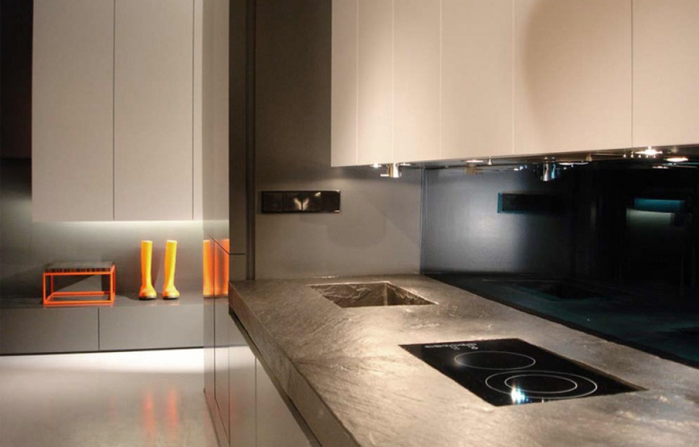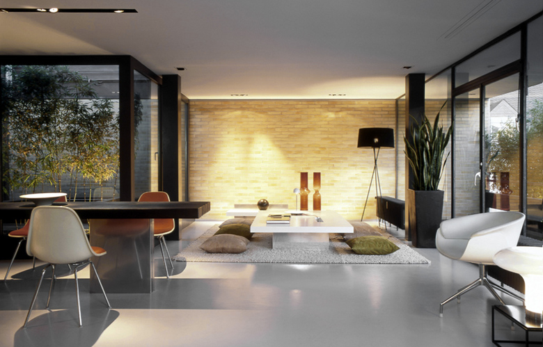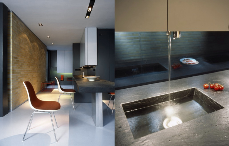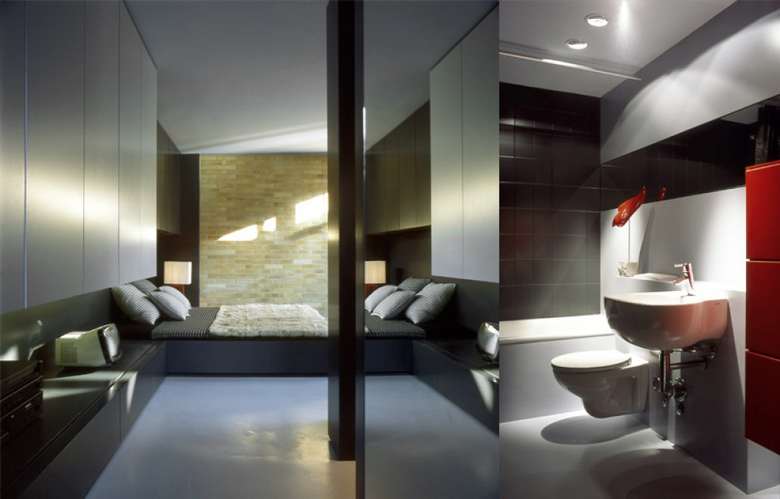 Viel Fläche und zwei Atriuminnenhöfe bot das 50er-Jahre Penthouse über den Dächern Frankfurts. Der Grundriss wurde neu organisiert. Ein Atrium mit Bambusgarten und Whirlpool, ein Atrium mit Koiteich und ein sechs Meter langer Ess- und Kochbereich verbinden sich in der vorhandenen Struktur zu einem kosmopolitischen, weitläufigen Ambiente. Die sandfarbenen Klinkerwände stehen im Kontrast zu anthrazit und hellgrau. So erinnert die Küche gleichwohl wie der Schlafbereich mehr an eine fließende Raumskulptur als an eine konventionelle Raumnutzung. Die verschiedenen Raumbereiche wurden ausschließlich über puristische Möbeleinbauten mit unsichtbaren Schiebetüren, integrierte Beleuchtung und verborgener Technik zoniert. Lichtdurchflutete Räume wechseln sich ab mit introvertierten Rückzugsbereichen. Reduktion in der Gestaltung bildet den Hintergrund für persönliche Lieblingsstücke.