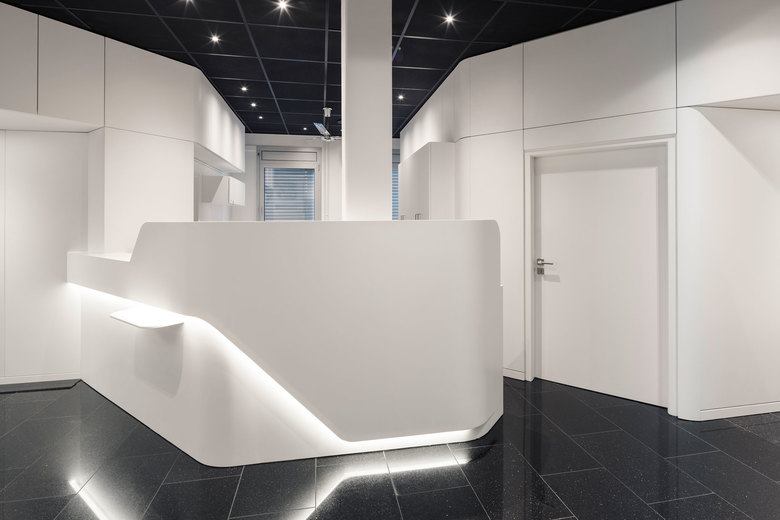 Ausschlaggebend für die Gestaltung der Räumlichkeiten waren hochwertige Hygienestandards sowie ein für eine Arztpraxis erforderliche klare und aufgeräumt wirkende Typologie. Das zentrale Element der chirurgischen Praxis ist eine maßgefertigte und individuell gestaltete Theke, die im Rahmen des hoch effizienten Betriebs in den Praxisräumlichkeiten den Patienten als Anlaufstelle dient. Die Farben Schwarz, repräsentiert durch geschliffenen schwarzen Granit, einem Nero Assoluto, und Weiß organisieren die Gestaltung des Raums. Die Farben versinnbildlichen den hohen Hygienestandard und strahlen Professionalität aus. Zusätzlich schafft die Gestaltung auf diese Weise Vertrauen unter den Patienten.