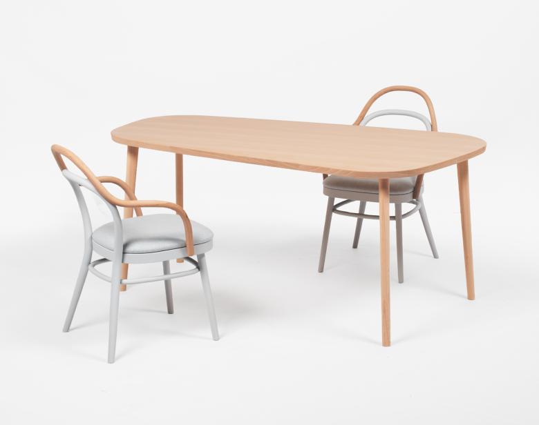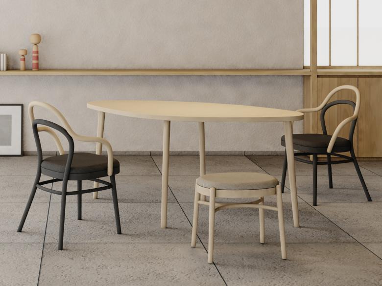 Developed in collaboration with Akita Wood Works, Japan’s only furniture workshop specializing in three-dimensional curved wood technology since 1910. We pursued practicality and design to make the product more in tune with the compact lifestyle of modern people. The gentle curves of the curved wood are designed not only to create soft air in the room, but also to reduce weight and provide comfortable seating. Local timber from the Tohoku region was utilized, and colors were selected from traditional Japanese colors.