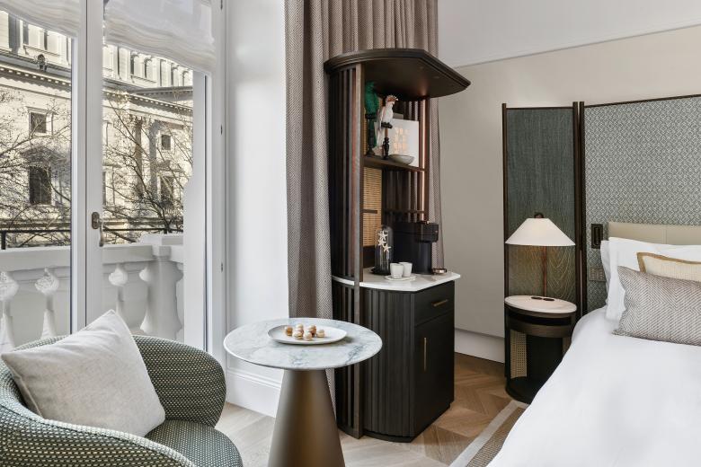 The hotel includes 44 rooms and suites spread over 5 floors. Each floor evokes the history of Switzerland's textile trade with different countries or regions. Thus, attributes of Spain, France, England, India and Asia can be found in fabrics, inlays and decorative elements. Overall the room design is a lyrical interpretation of a voyager’s lifestyle at the turn of the century.