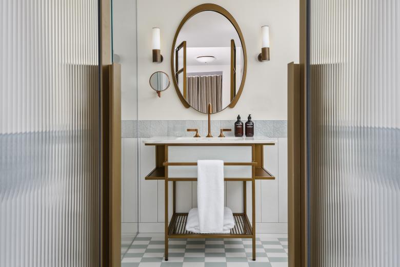 The bathroom is a luxurious retreat, featuring soft green and beige mosaic floors inspired by the original design. Art Nouveau white glazed tiles with a decorative band adorn the walls, creating a stunning backdrop for the custom marble vanity. The Dornbracht Vaia fixtures add a sophisticated, timeless touch, offering all the amenities for a perfect stay.