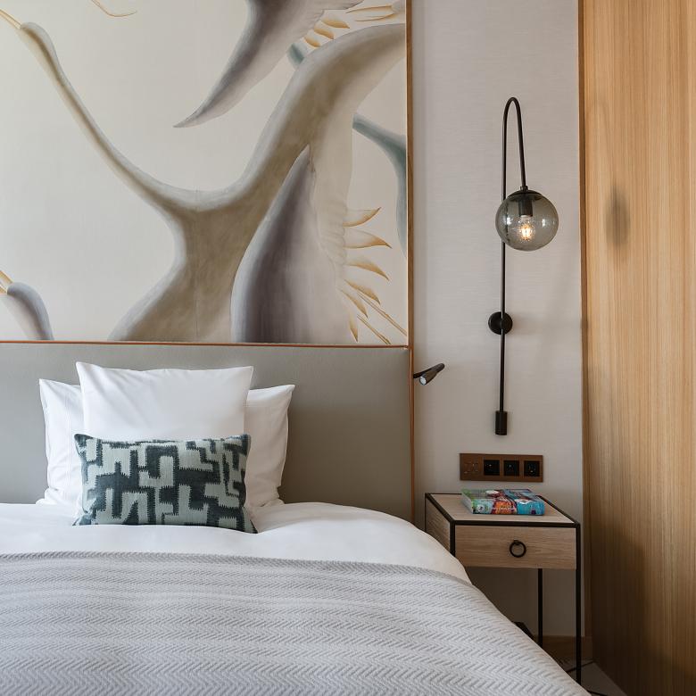 Each room and floor features a unique, hand-painted stork artwork, and even the reception counter is modeled after the wing of a stork.